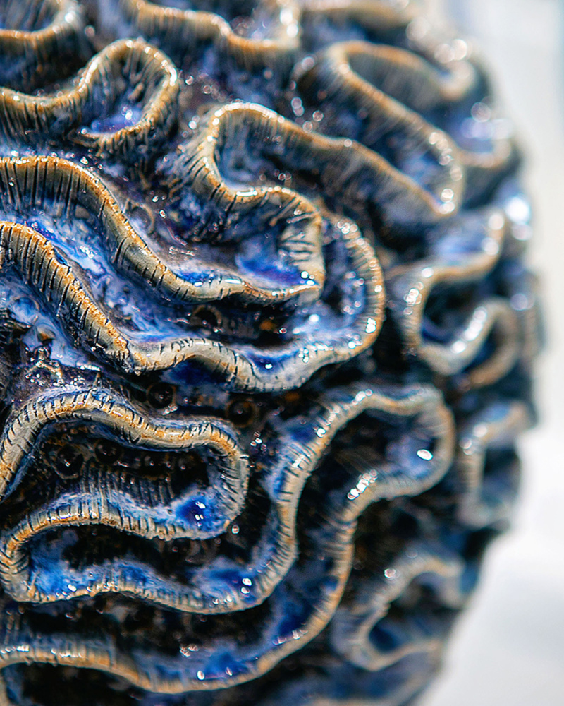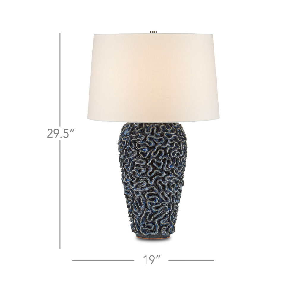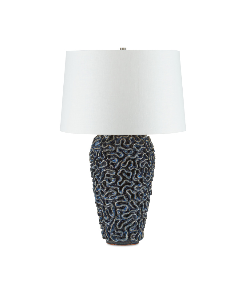 The Milos Blue Table Lamp is made by a group of women who live at the border of Burma and Thailand. Made from black terracotta, this incredible hand-thrown dark blue lamp has a swirled surface that looks like brain coral. The lamp is glazed in a rich deep reactive blue.