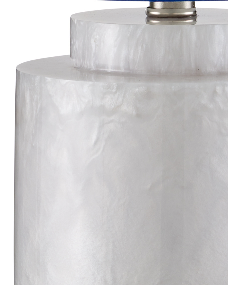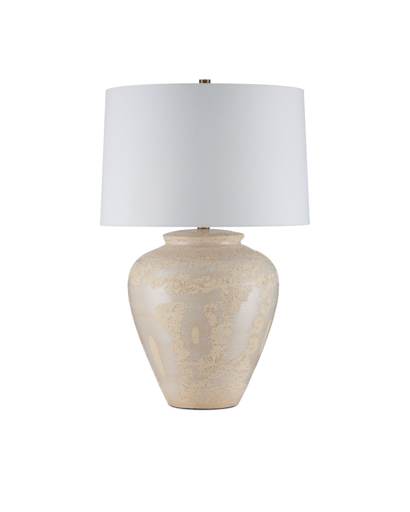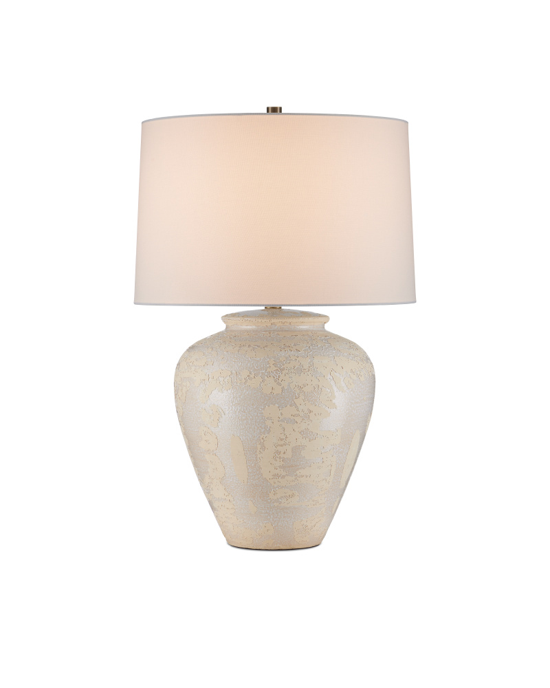 The Mimi Ivory Table Lamp is made of ceramic with a mix of ivory and cream glazing, which creates a swirling pattern to give its surface tone-on-tone depth. The ginger-jar shape of the cream-colored lamp is topped with an drum shade that echoes the pale hues in its body. The artisanal quality comes into full view when the surface of the lamp is viewed close up.