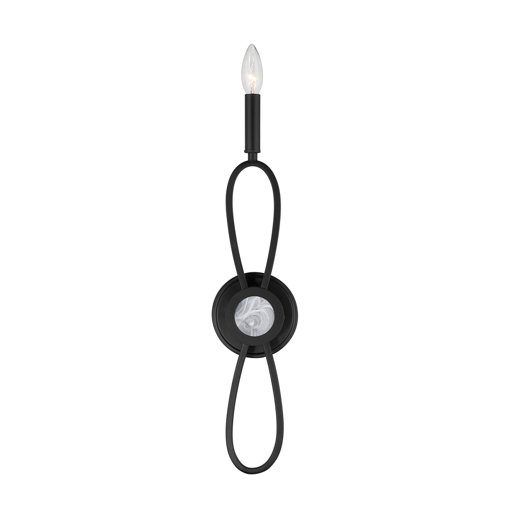The Savoy House Minette 1-light sconce celebrates the artistry of glass. A beautifully formed disk of strie glass, alive with soft, swirling texture, is gently cradled by curved arms that echo the shape of unfolding petals. The Matte Black finish adds dramatic contrast and depth. Minette is 21.25" high, 5" wide and extends 2.5" from the wall. Uses one candelabra size bulb of up to 60 watts. Bulb not included. Damp area rated.