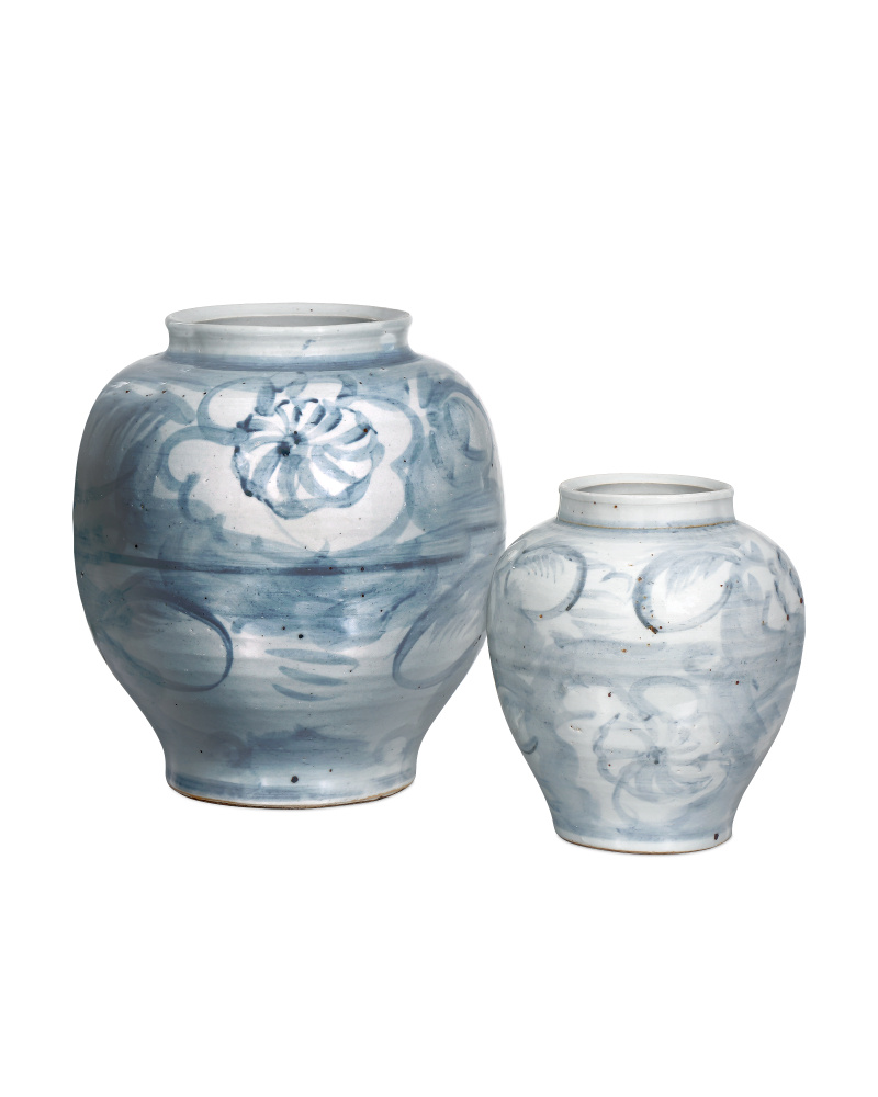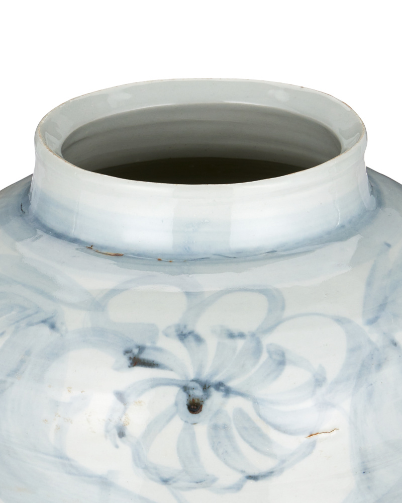 Modern interpretations of the tradition of Chinoiserie that dates back to the great dynasties in Asia, the Ming-Style Countryside Large Preserve Pot is made of porcelain. The design tells its "story" in pale blue motifs on an off-white ground. Because these are artisanal pieces handmade by families with generations of expertise, the color and pattern may vary slightly.