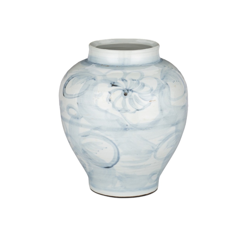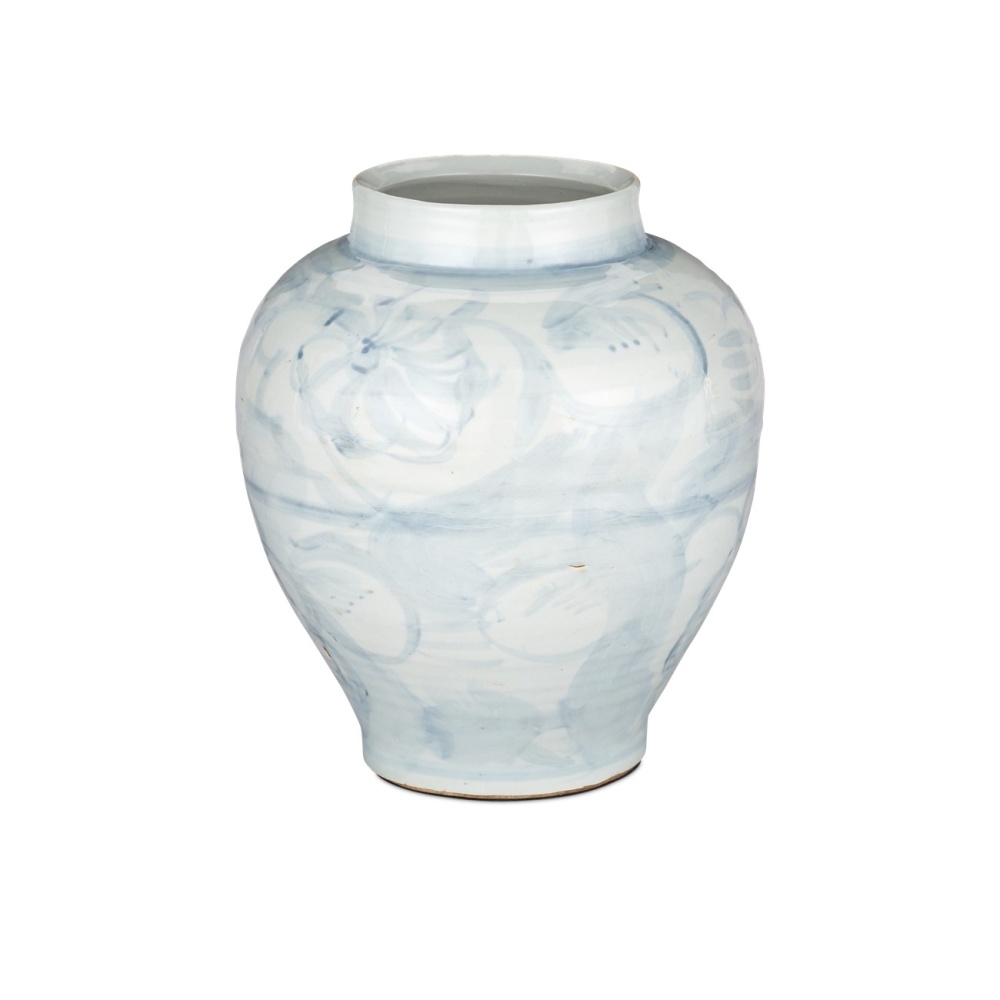 Modern interpretations of the tradition of Chinoiserie that dates back to the great dynasties in Asia, the Ming-Style Countryside Medium Preserve Pot is made of porcelain. The design tells its "story" in pale blue motifs on an off-white ground. Because these are artisanal pieces handmade by families with generations of expertise, the color and pattern may vary slightly.