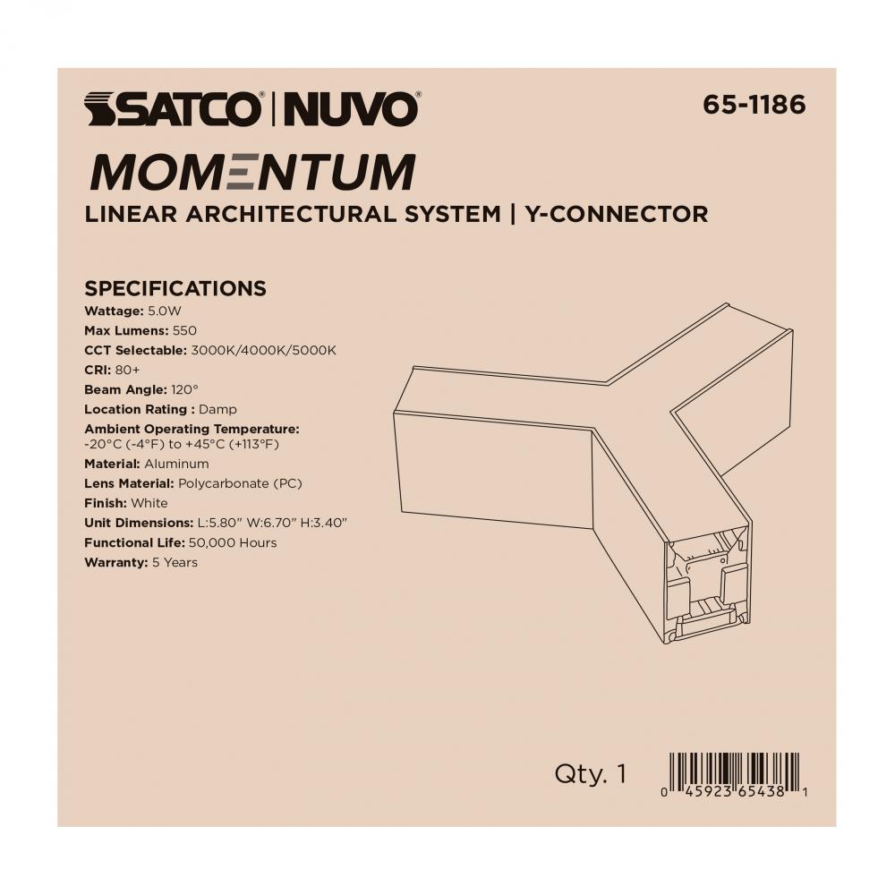 SATCO's 65-1186 Y-Connector is available in a white finish. This component allows for unique and specific layouts beyond typical L, T, or X shapes. It enables branching designs and complex angles to meet creative needs.