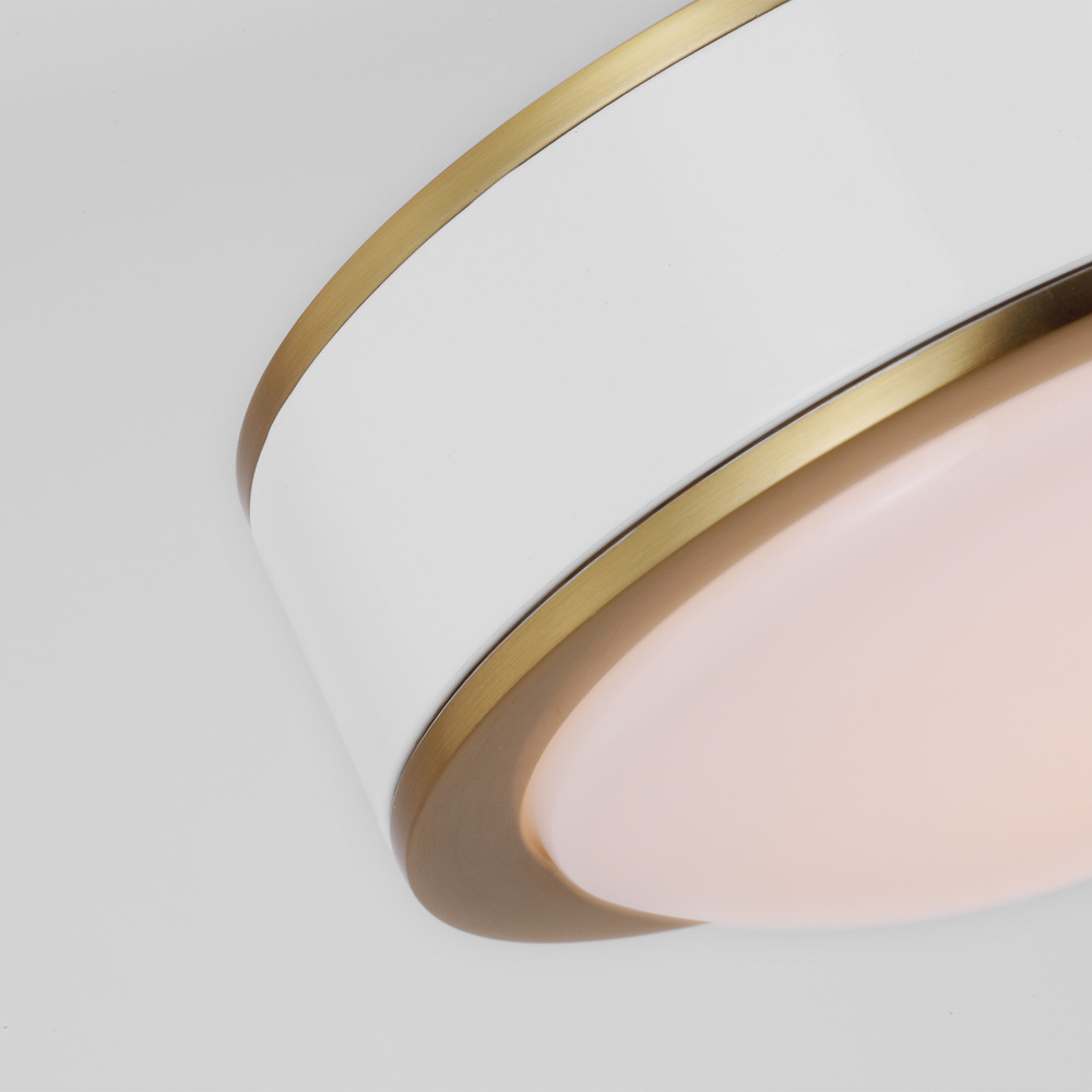 The Monroe LED flush mount is inspired by graphic enameled metal jewelry and decorative accessories from kate spade with a nod to late 50s atomic era colorful designs. Monroe exhibits clean lighting profiles and dressed them up with painted sections and metal accents.