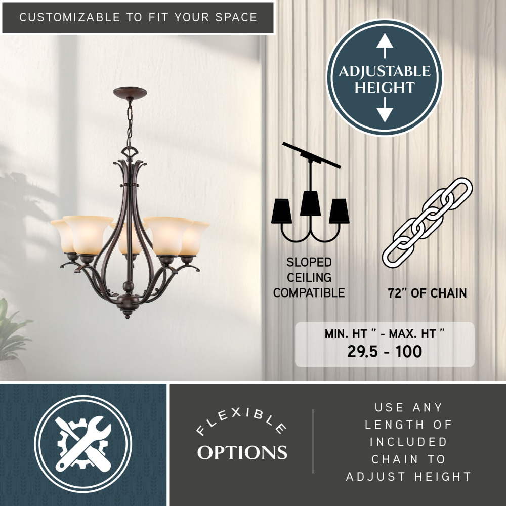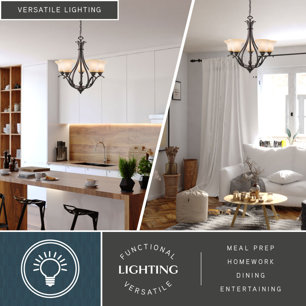 The soft traditional lines of the Monrovia collection allow you to combine styles within your home without compromising on design. The royal bronze finish and brushed cognac glass add a certain level of sophistication and elegance that is rare to achieve. Update your look with a hint of class. This fixture is part of a full collection with coordinating pieces to decorate any room in the house. This chandelier is ideal for kitchens, dining areas, and foyers.