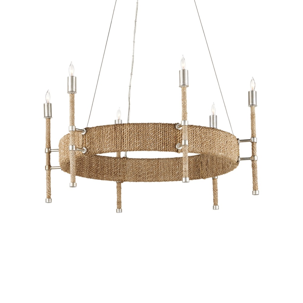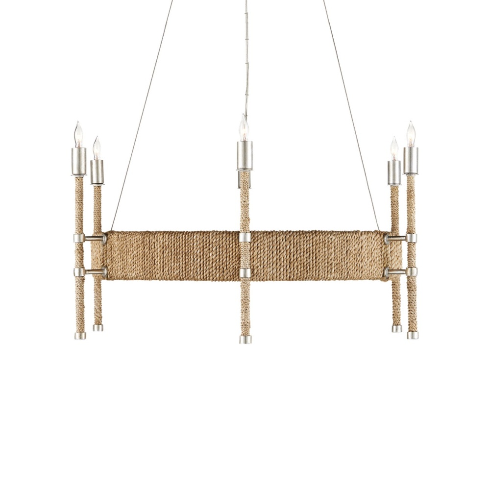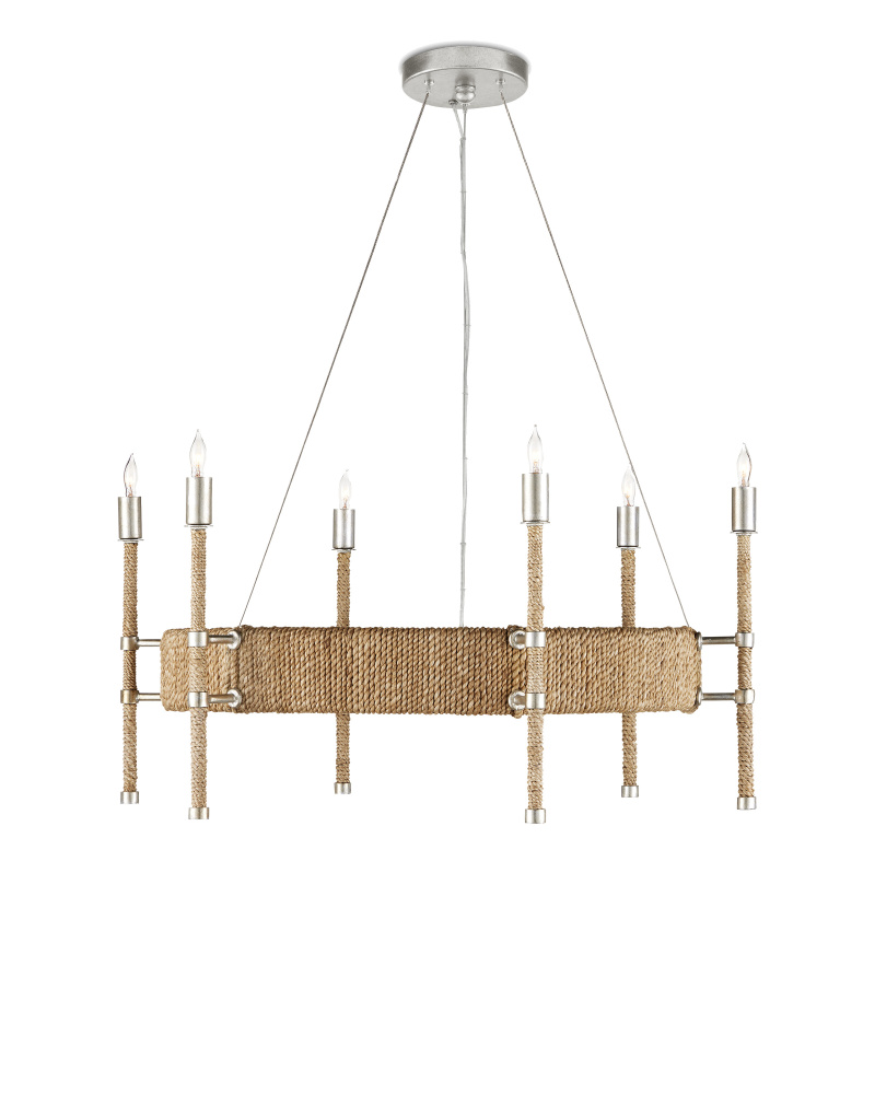 The Monzie Chandelier has a surprising mix of contradictions: the rope-wrapped frame and stems are warm elements of the design, while the contemporary silver leaf finish on the steel is bright. The way the stems are cleverly fitted to the wide band is a highly-refined design element; as are the caps at the bottom of each, the clasps on the fasteners, and the modern bobeches. Adjustable from 30" to 95.5" with use of included chain/rod kit/cable. If your space calls for a longer drop, additional chain/rods/cable is available for purchase.