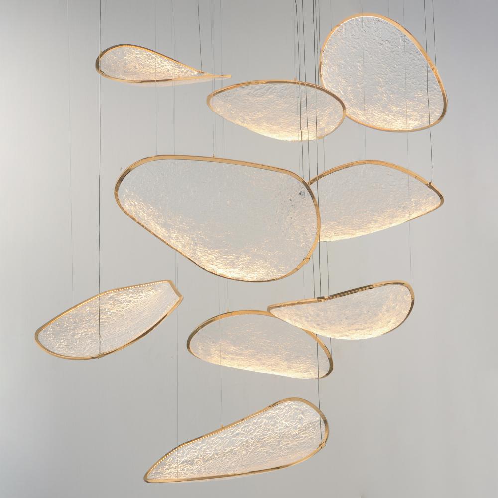 A triumph of scale, craft, and light, Moonscapes transforms celestial inspiration into a breathtaking installation. Monumental in form yet ethereal in presence, each irregularly shaped panel evokes the cratered terrain of the lunar surface with dramatic te