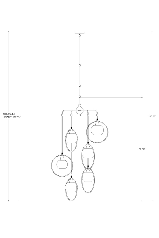 The Moorsgate Multi Pendant embodies mid-century modern style with its asymmetrical cascade. The circles of wrought iron surrounding the glass globes in a Blacksmith finish make this black pendant a lively contrast of materials. Adjustable from 69" to 105" with use of included chain/rod kit/cable. If your space calls for a longer drop, additional chain/rods/cable is available for purchase.