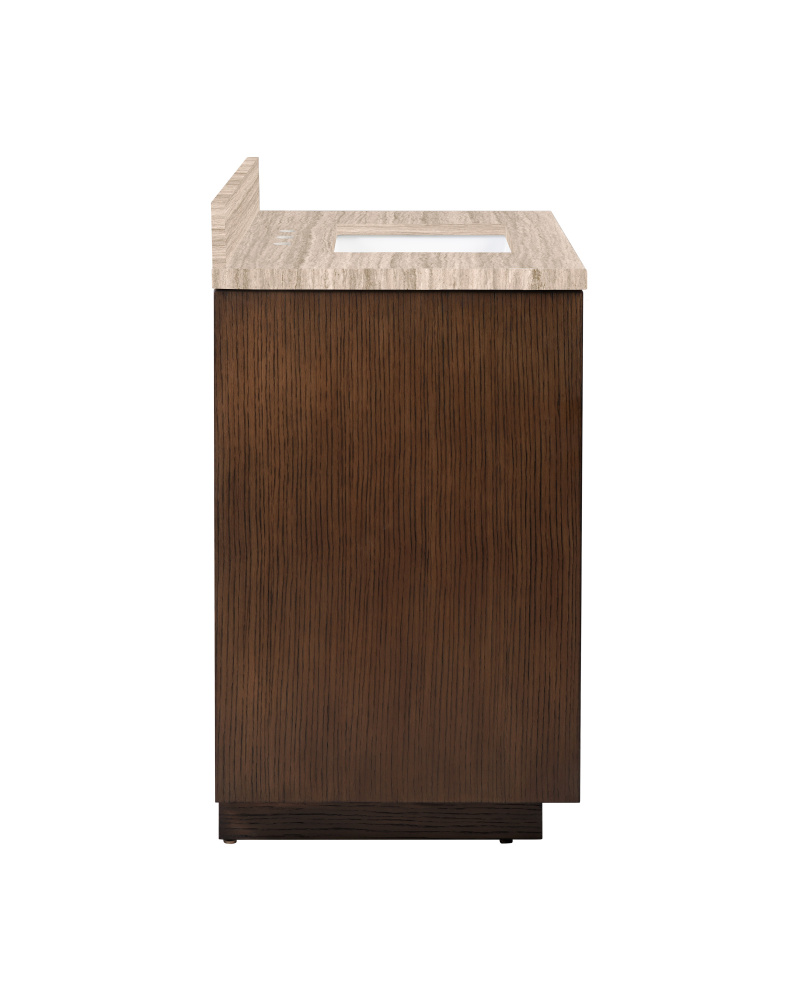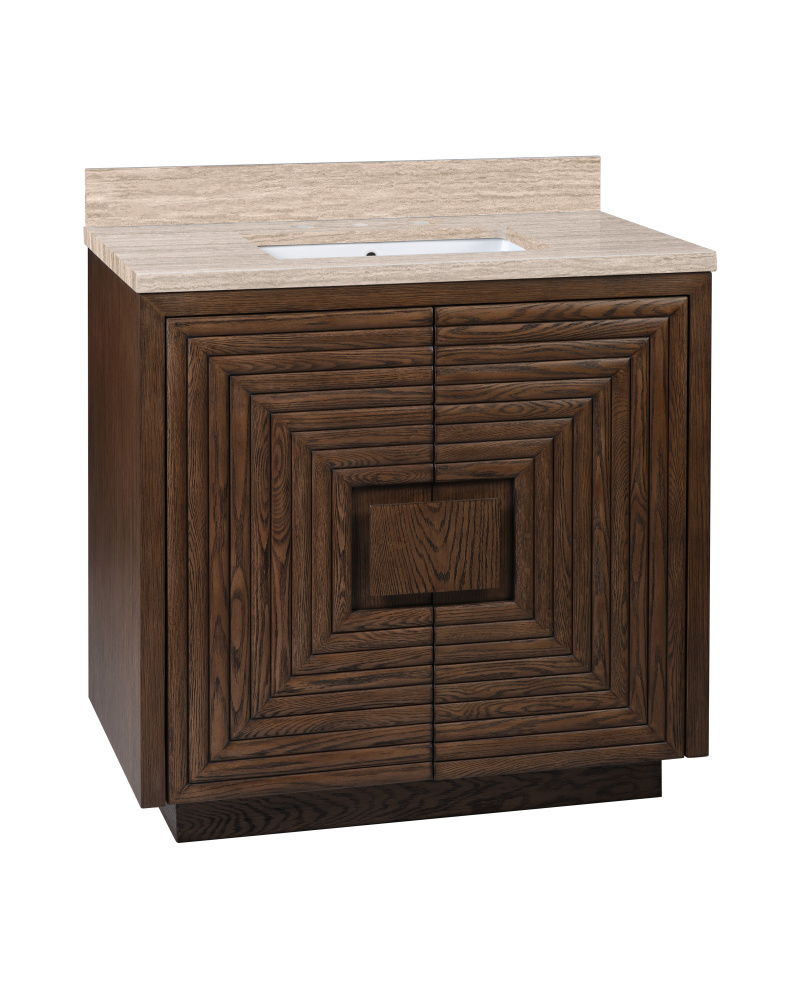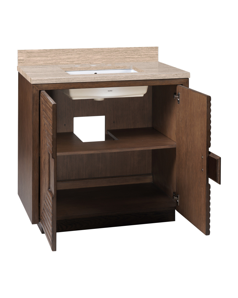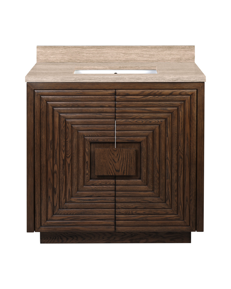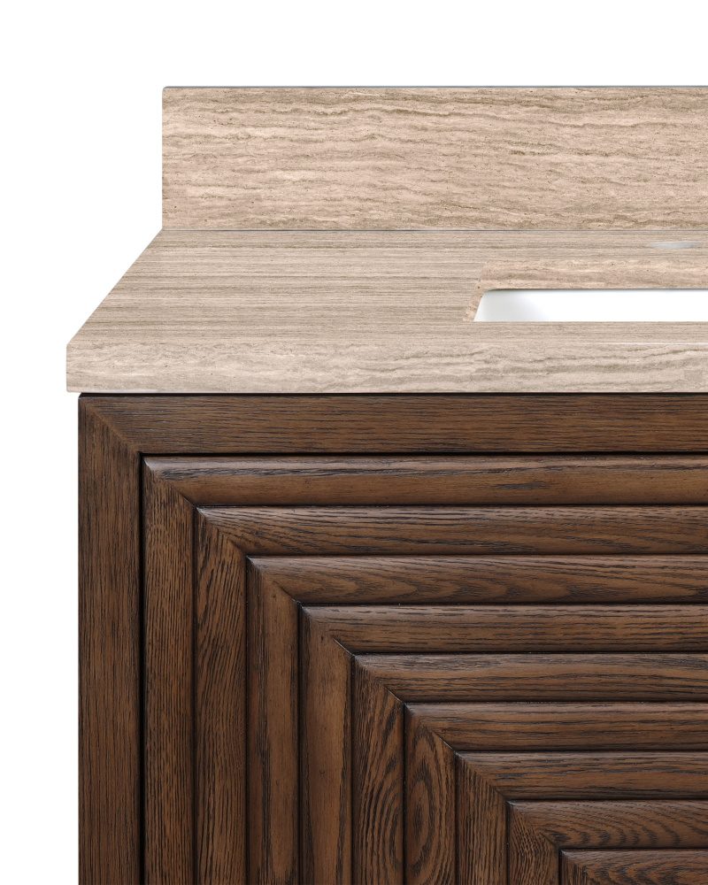 The deep-toned distressed cocoa finish on the Morombe 36" Cocoa Vanity highlights the patterns of natural wood that form embedded squares in a geometric illusion of depth. The interior has one adjustable shelf and there are two optional wood trays that attach to the inside of the doors. The travertine top is fitted with a rectangular undermount sink. Other fine design attributes include soft-close door hinges and a matching marble backsplash.