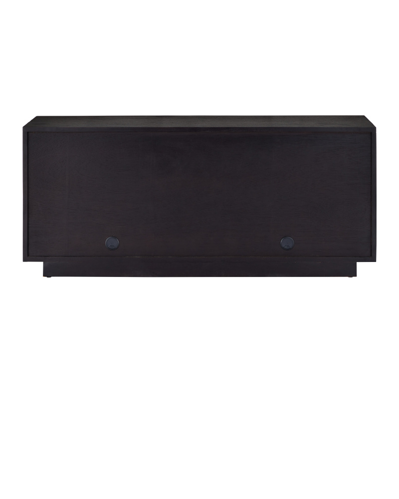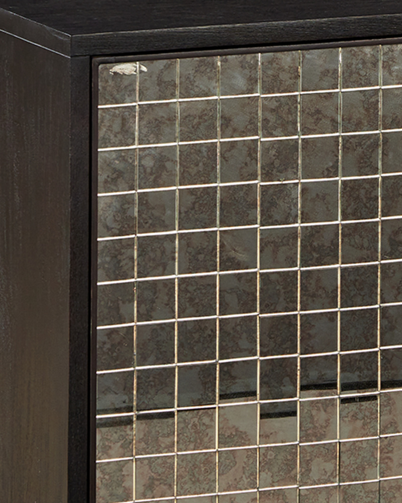 The Mosaico Credenza blends texture, craftsmanship, and timeless style. Its doors are clad in a mosaic of antique mirror tiles individually hand-placed to fit seamlessly in a black wood frame. The mirrored cabinet sits on a plinth base that adds a refined detail, as does the combination of aged mirror surfaces and contrasting dark wood.