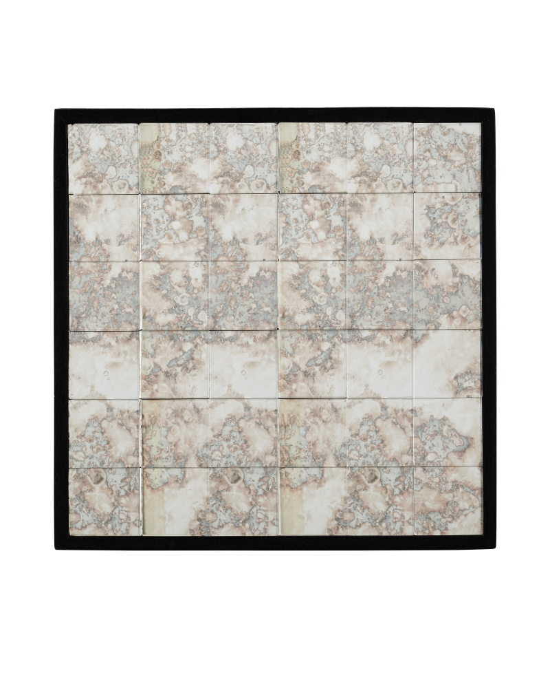 The Mosaico Pedestal blends texture, craftsmanship, and timeless style. Its sides and top are clad in a mosaic of antique mirror tiles individually hand-placed to fit seamlessly in a black wood frame. The mirrored table sits on adjustable levelers that raise it off the ground slightly. This is a refined detail, as is the combination of aged mirror surfaces and contrasting dark wood.