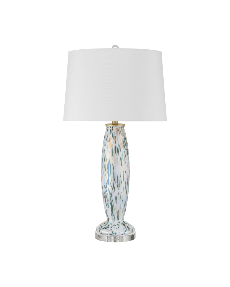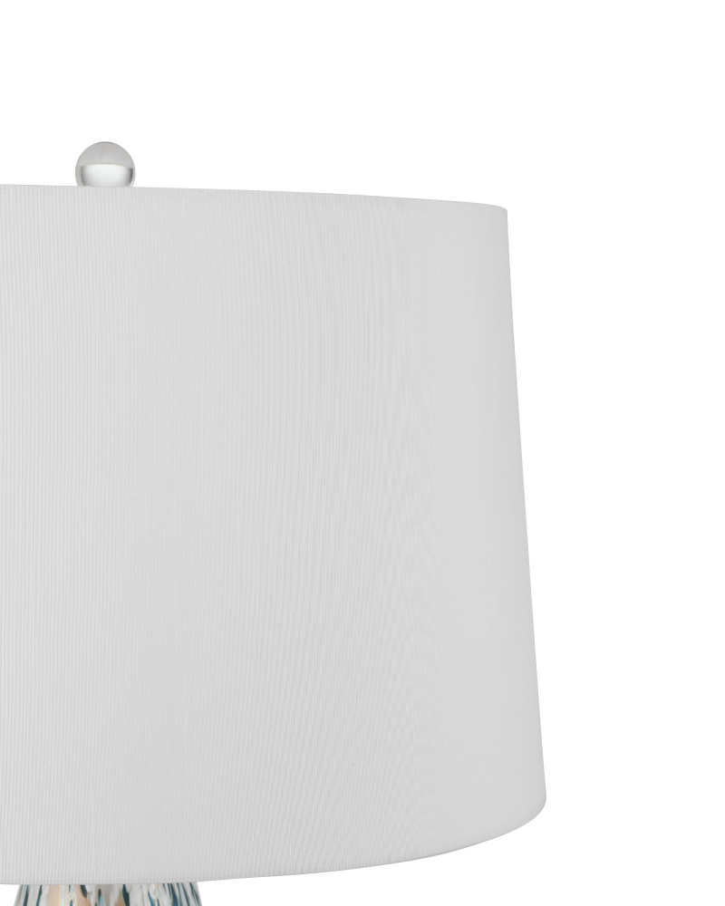 The Motte Table Lamp has a gleaming glass body on which streaks of opalescent white, green, and very soft peach flow to create a mesmerizing Easter-egg effect. Fitted with a pale shade, the body sits atop an optic crystal base. The Art Deco-inspired design is a nod to the tallest vase the prominent French glassmaker and designer Charles Schneider ever made. The swirling pattern brings the lamp a strong sense of movement achieved through a painstaking combination of marbling and glass-fusing techniques, which are difficult to do in tandem.