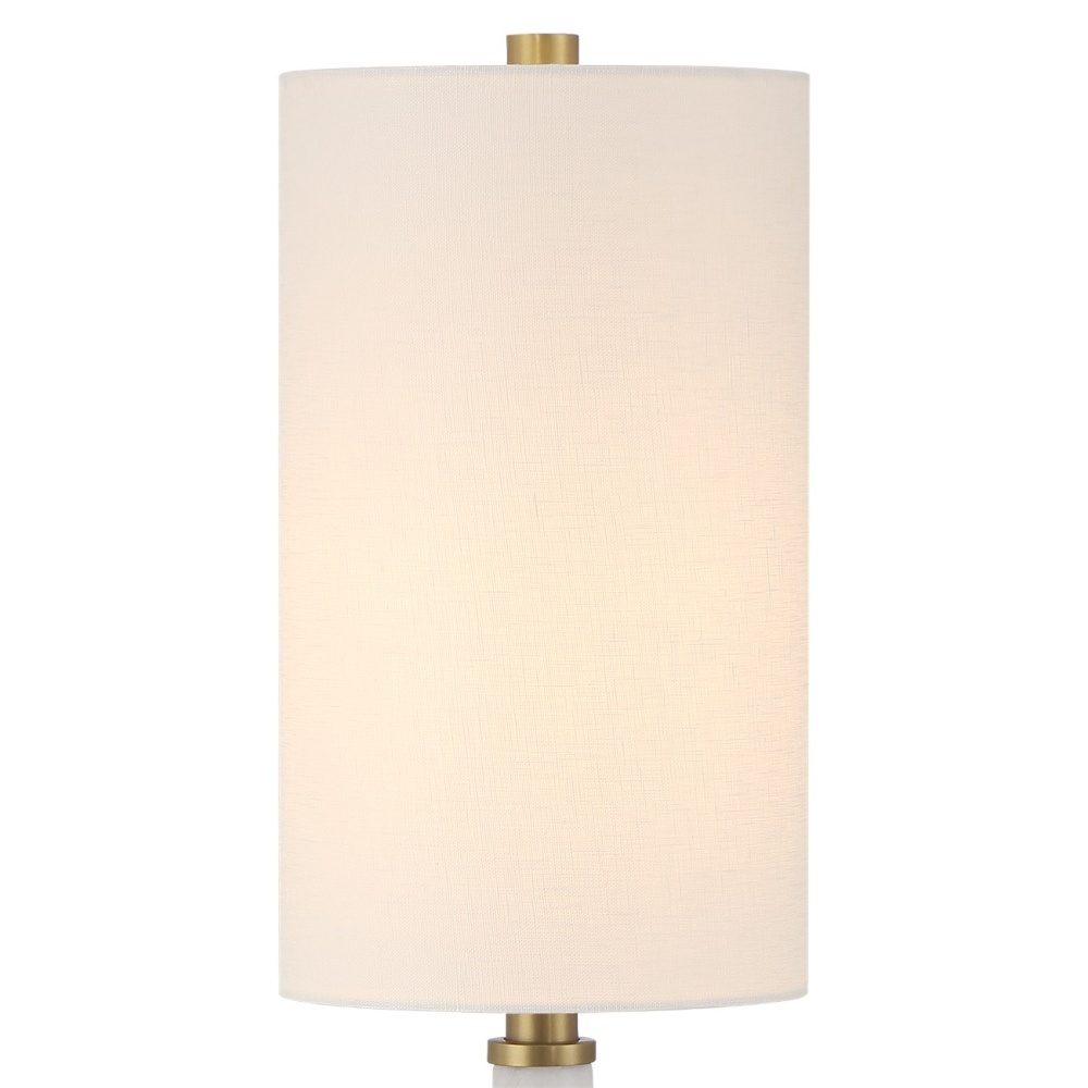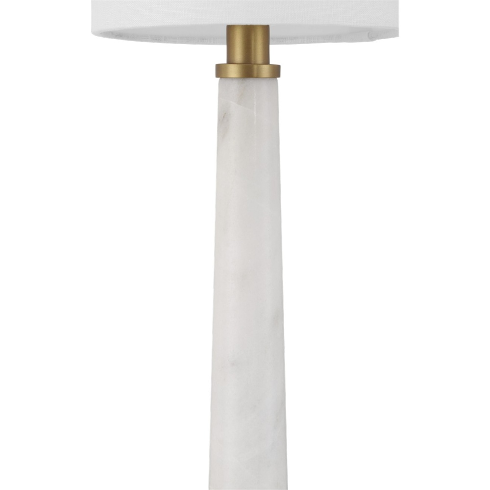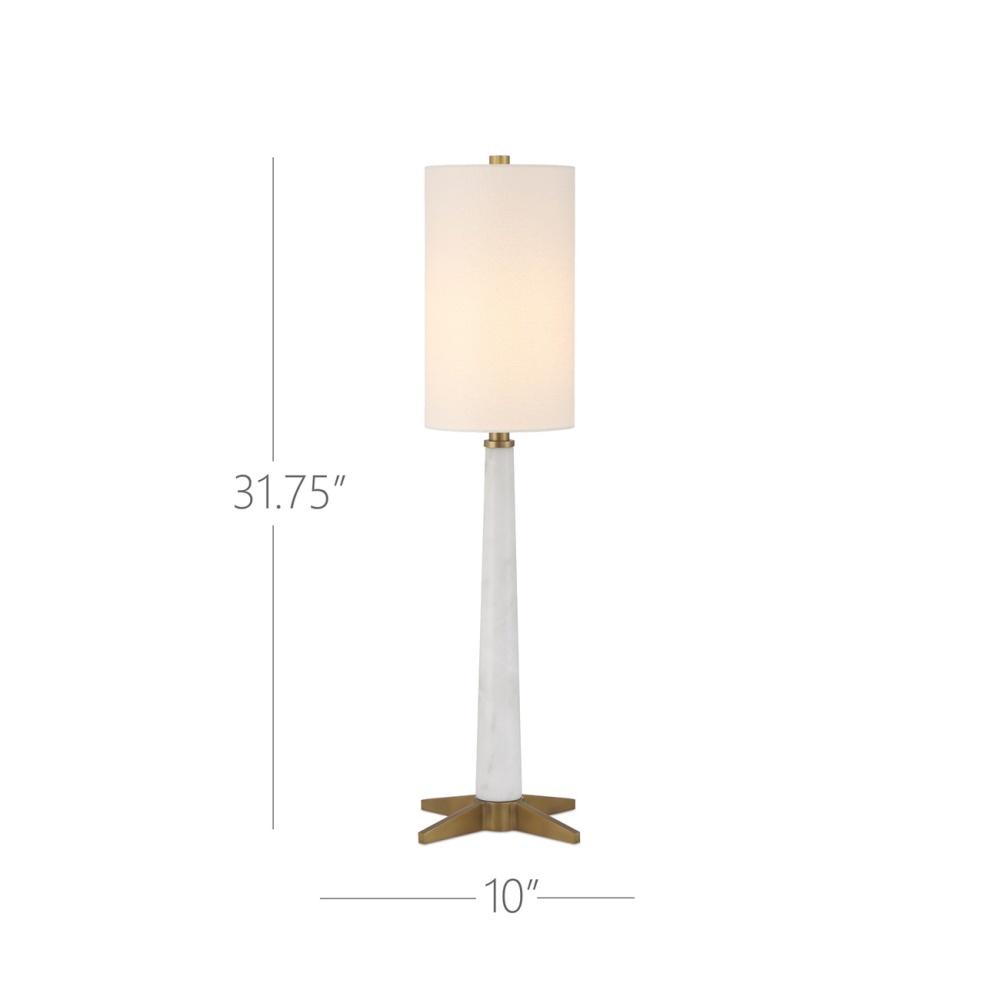 The Munroe White Table Lamp is a nod to minimalism that reflects the Art Deco style popular during the 1920s and 1930s. Tt has a compact footprint, though it is on the tall side at 32 uinches high. The telescoping body, made of white marble with gray veining rises from an X-style base in an antique brass finish, will vary slightly from piece to piece because it is made of natural stone.