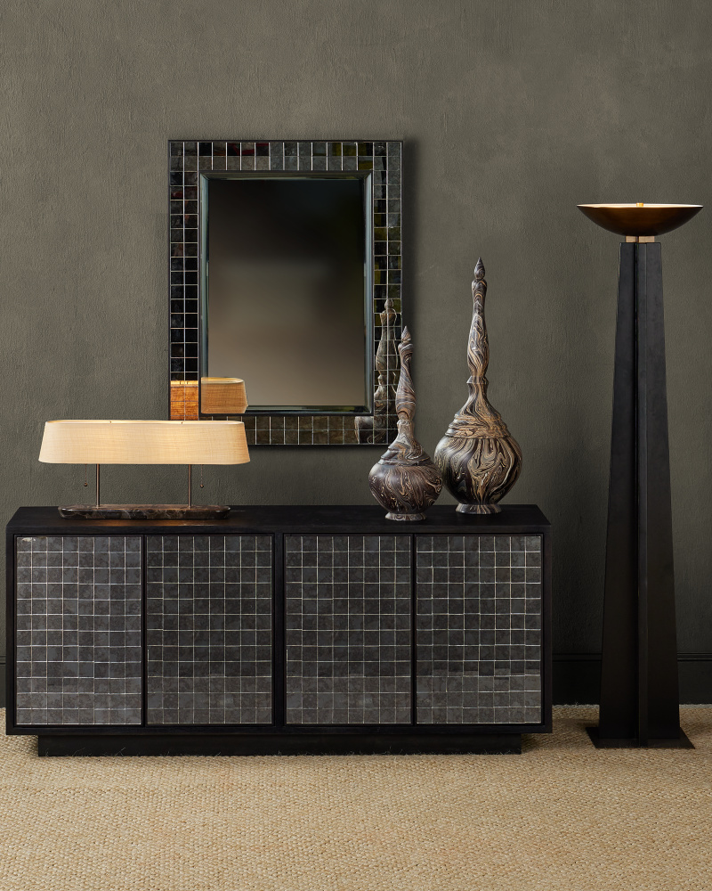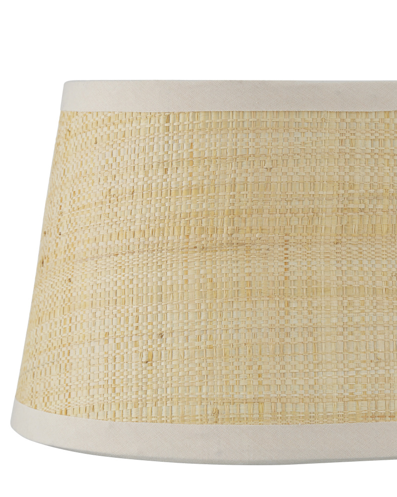 The Museum Desk Lamp draws from the iconic designs of the mid-century modern era, which was characterized by clean lines, organic forms, and a focus on functionality. Made of brown marble with ivory and cream veining, the lamp longer than it is tall. The woven rattan shade fitted to the two-light lamp and the pair of pull-chains are also reflective of the era. The metal in a dark bronze finish coordinates with the marble, which will vary slightly from lamp to lamp.