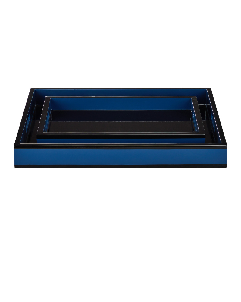 The luxuriousness of lacquer has been prized in interiors through the ages, and the Navy Lacquer Tray Set -- a pair of nesting decorative trays -- is an example of the artisanship that has given the treatment such lasting appeal. Made of wood, the pair of larger-than-average trays feature vibrant navy surfaces rimmed in rich black, which also covers the interior bottom surface. These trays are not food safe and not heat- or cold-resistant.