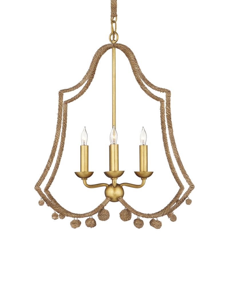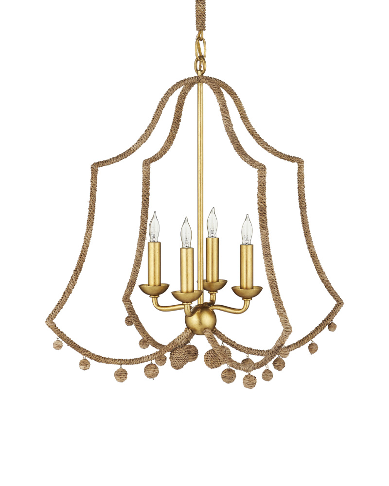 New in the Suzanne Duin Collection, the Nimes Chandelier is infused with the inimitable French flair she is known for. Both the double-bell shape and the ornamental balls that dangle from the bottom of the scallops express the quintessential charm for which the South of France is renowned. The frame, made of wrought iron in a contemporary gold leaf finish, is partially wrapped in natural Lampakanay rope, as are the tiny globes that hang beneath it. Adjustable from 27.5" to 76.5" with use of included chain/rod kit/cable. If your space calls for a longer drop, additional chain/rods/cable is available for purchase.