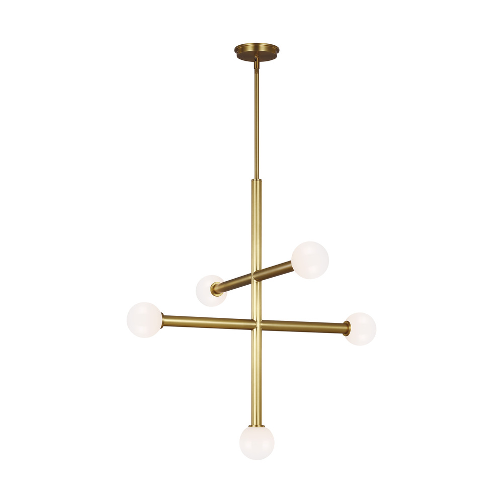 The Nodes five light linear chandelier by Kelly Wearstler supplies ample lighting for your daily needs, while adding a layer of today's style to your home's décor. Nodes task, ceiling and wall lighting is minimal yet bold, highlighting Kelly's distinctive juxtaposition of mixed-materiality and curvilinear form. Light radiates from milk glass globes set against metal discs. All fixtures can be used or without the discs. The cast canopy is available in Burnished Brass or Midnight Black. Hanging fixtures within this family feature black fabric cords, while pivot sconces can be cord and plug or hard wire.