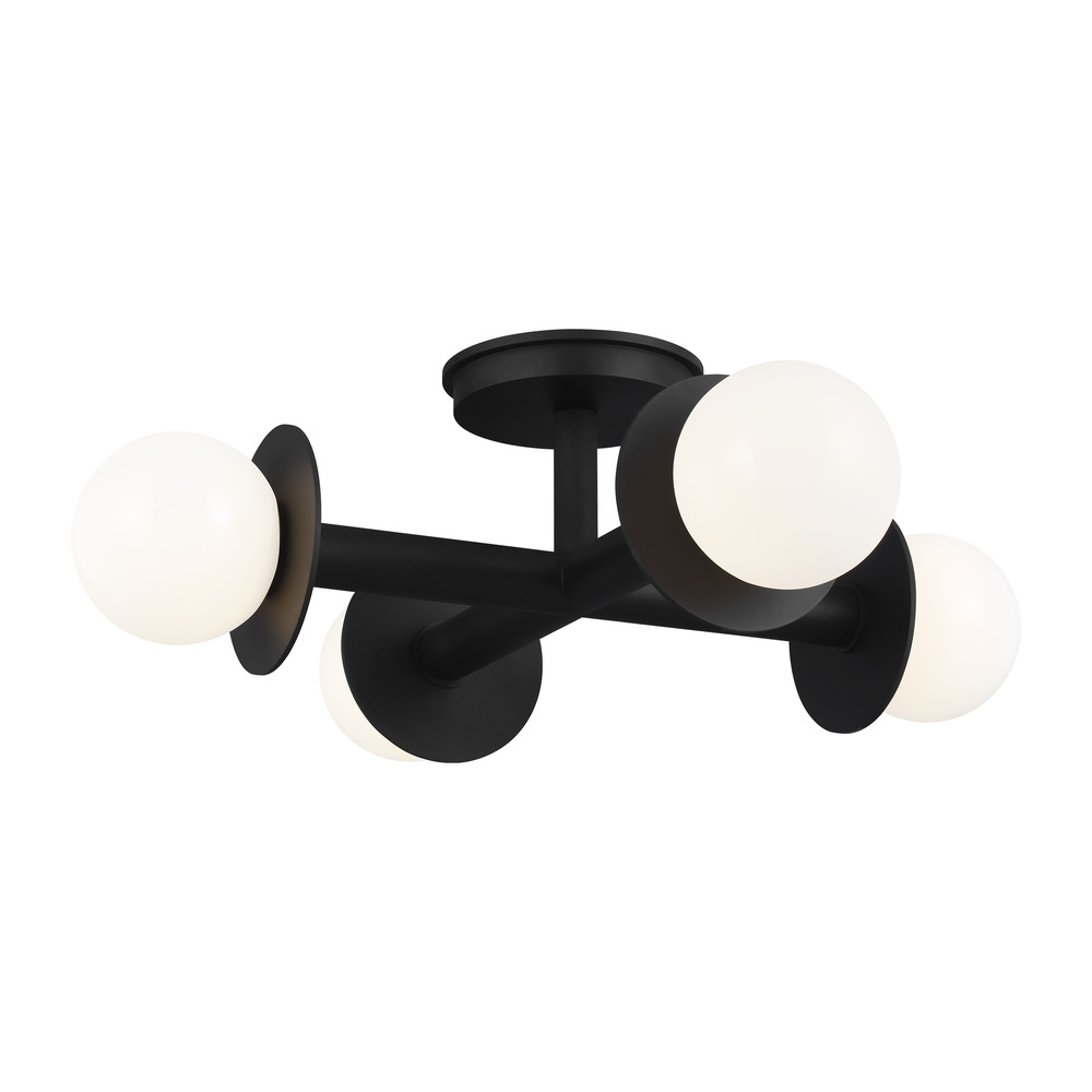 Nodes task, ceiling and wall lighting is minimal yet bold, highlighting Kelly's distinctive juxtaposition of mixed-materiality and curvilinear form. Light radiates from milk glass globes set against metal discs. All fixtures can be used or without the discs. The cast canopy is available in Burnished Brass or Midnight Black. Hanging fixtures within this family feature black fabric cords, while pivot sconces can be cord and plug or hard wire.