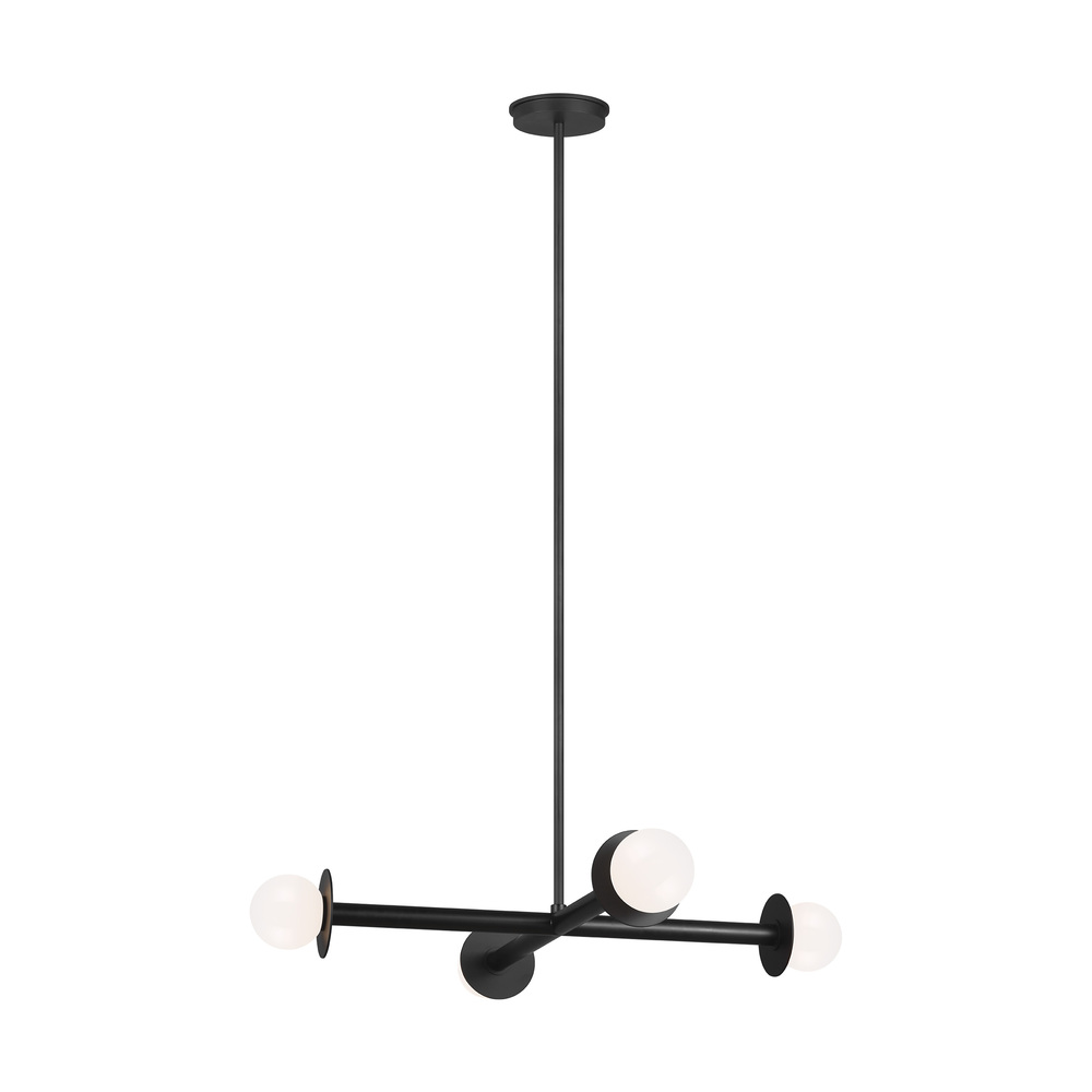 The Nodes four light single tier wide chandelier by Kelly Wearstler enhances the beauty of your home with ample light and style to match today's trends. Nodes task, ceiling and wall lighting is minimal yet bold, highlighting Kelly's distinctive juxtaposition of mixed-materiality and curvilinear form. Light radiates from milk glass globes set against metal discs. All fixtures can be used or without the discs. The cast canopy is available in Burnished Brass or Midnight Black. Hanging fixtures within this family feature black fabric cords, while pivot sconces can be cord and plug or hard wire.