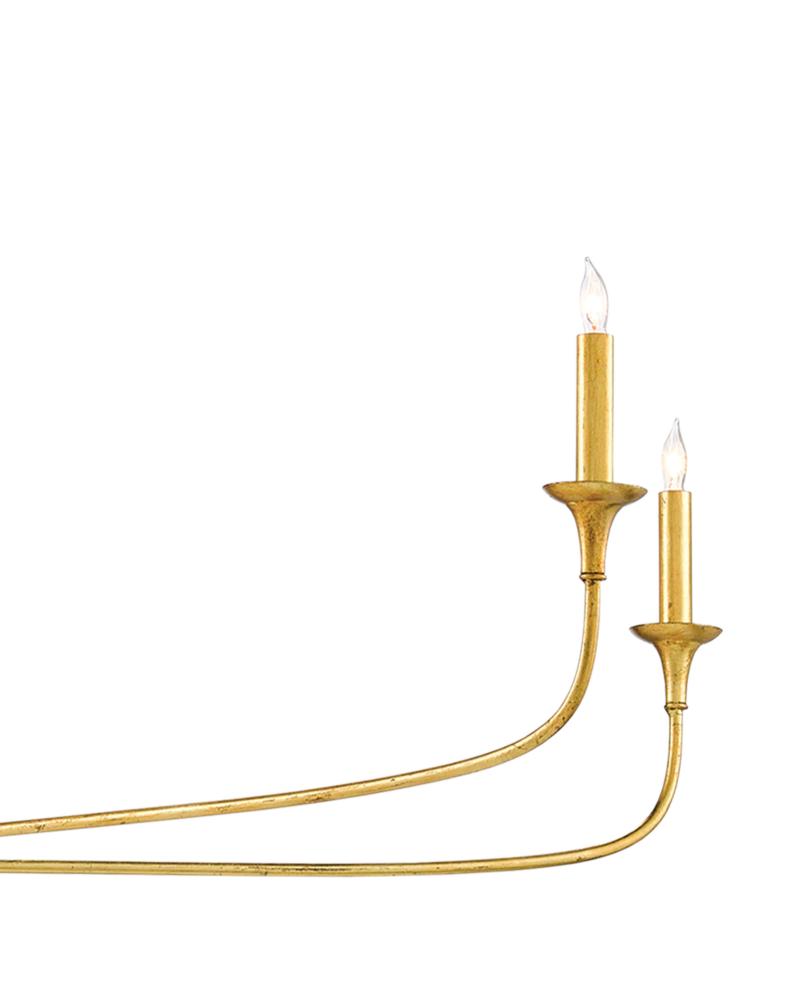 Design notes on the Nottaway Gold Large Chandelier include long arms that stretch gracefully from a small cog and a ring that ornaments its bottom-most point. The profile of the fixture has a lovely fluidity to it, and the contemporary gold leaf finish adds textural interest to the gold chandelier. Adjustable from 32.75" to 99.75" with use of included chain/rod kit/cable. If your space calls for a longer drop, additional chain/rods/cable is available for purchase.