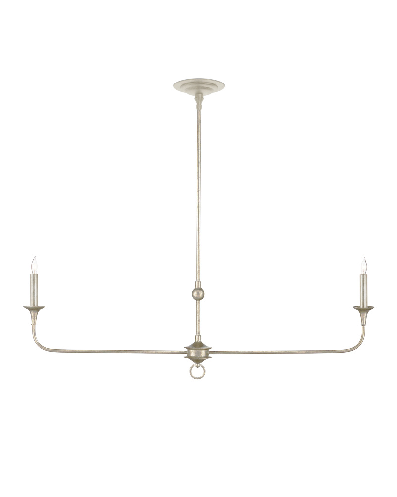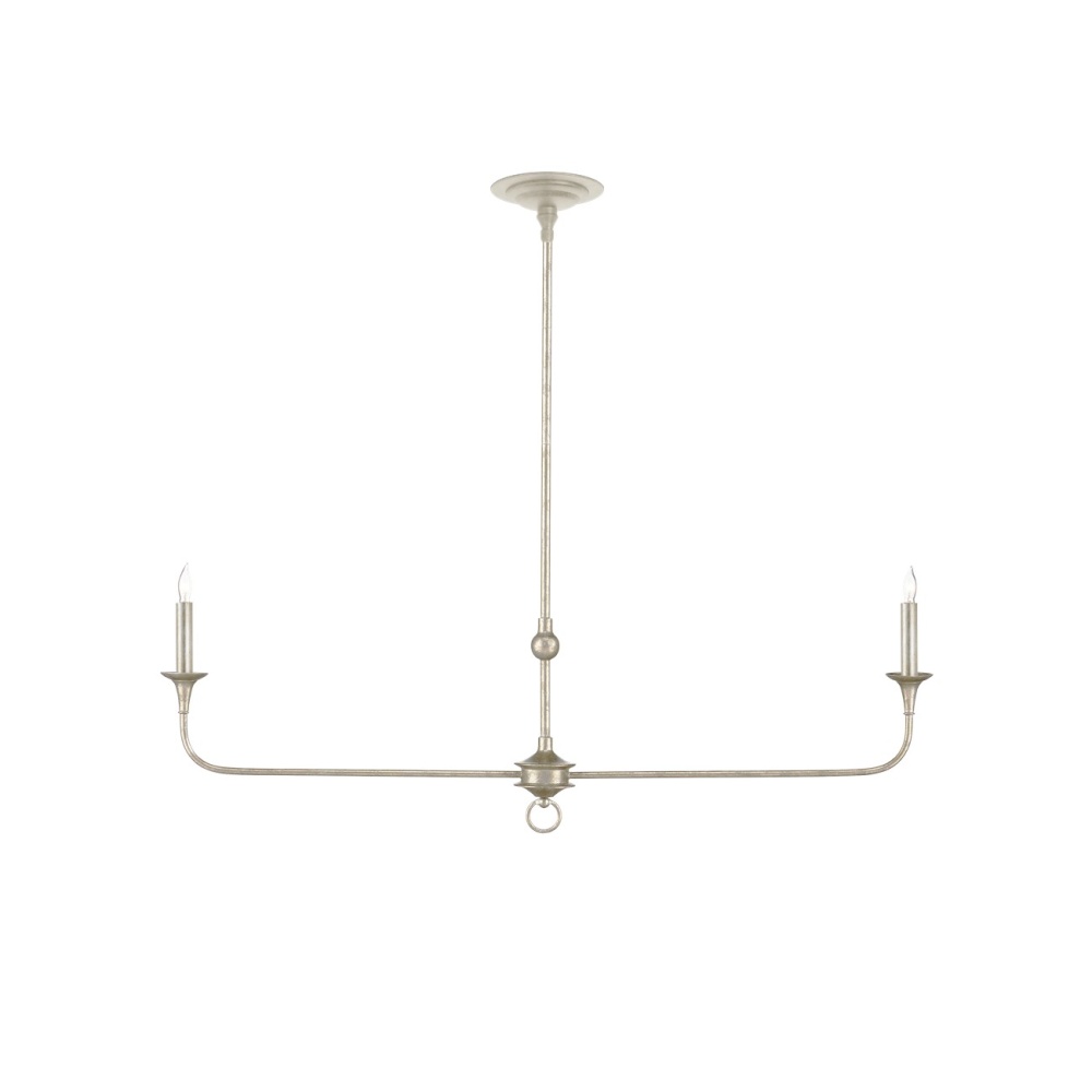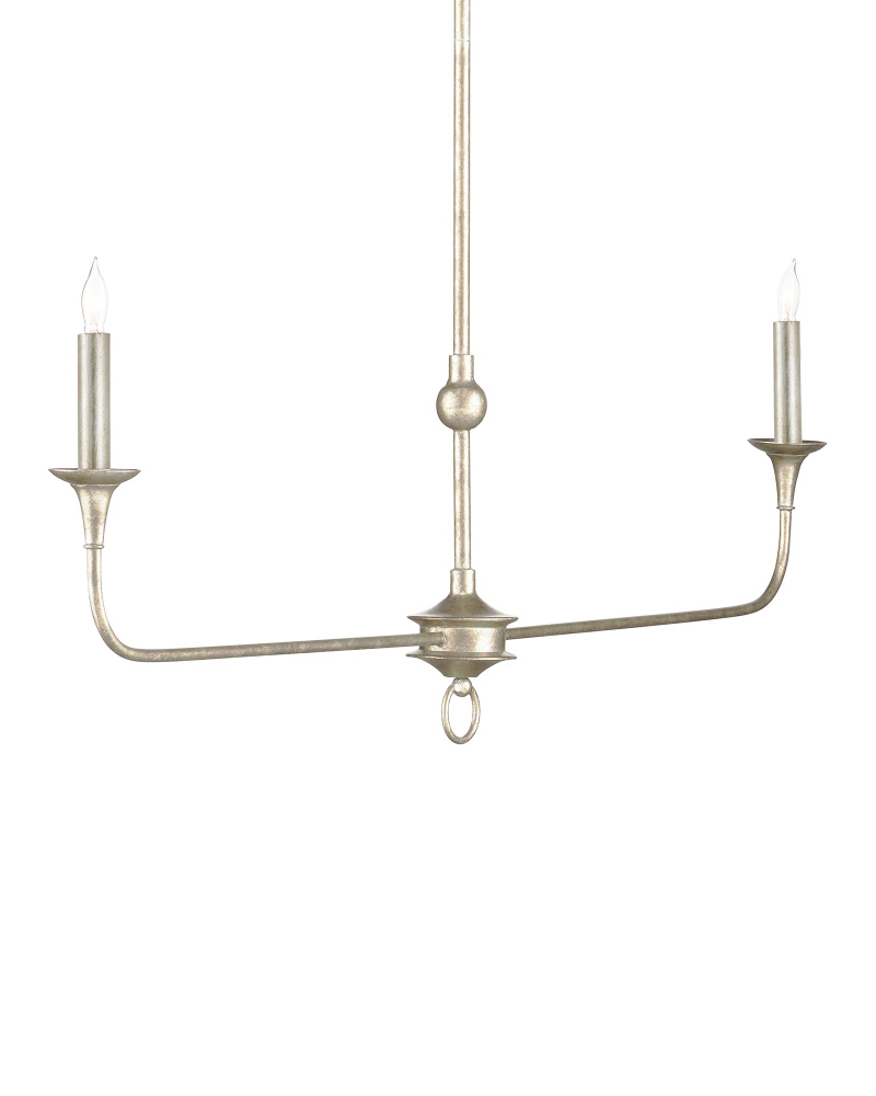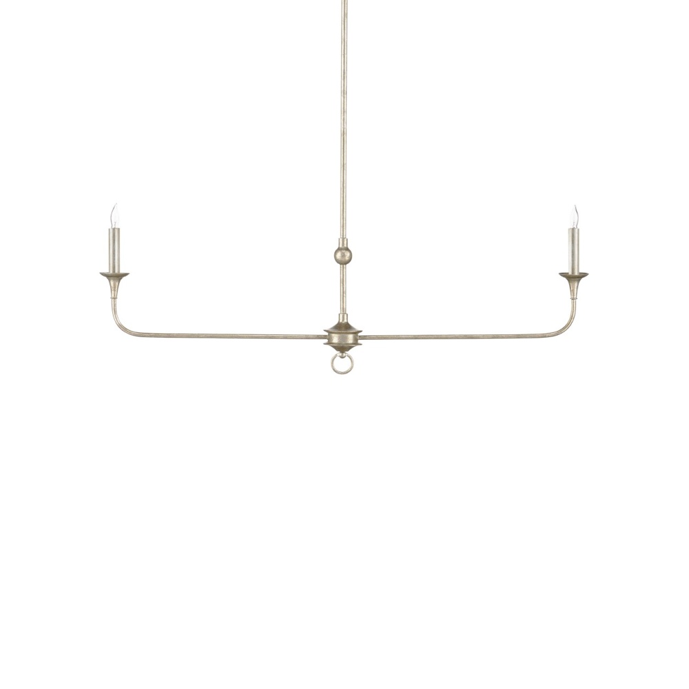 The arms of the Nottaway Linear Champagne Chandelier stretch gracefully from a petite cog at the bottom of its long, thin stem, which is ornamented with a dainty ring. Though the silver chandelier has minimalist lines, there is a sweeping fluidity to its profile that makes it a natural choice for above kitchen islands and bars or long dining room tables. The finish on the wrought iron frame brings textural interest to this dimmable two-light fixture. Adjustable from 23.25" to 65.25" with use of included chain/rod kit/cable. If your space calls for a longer drop, additional chain/rods/cable is available for purchase.