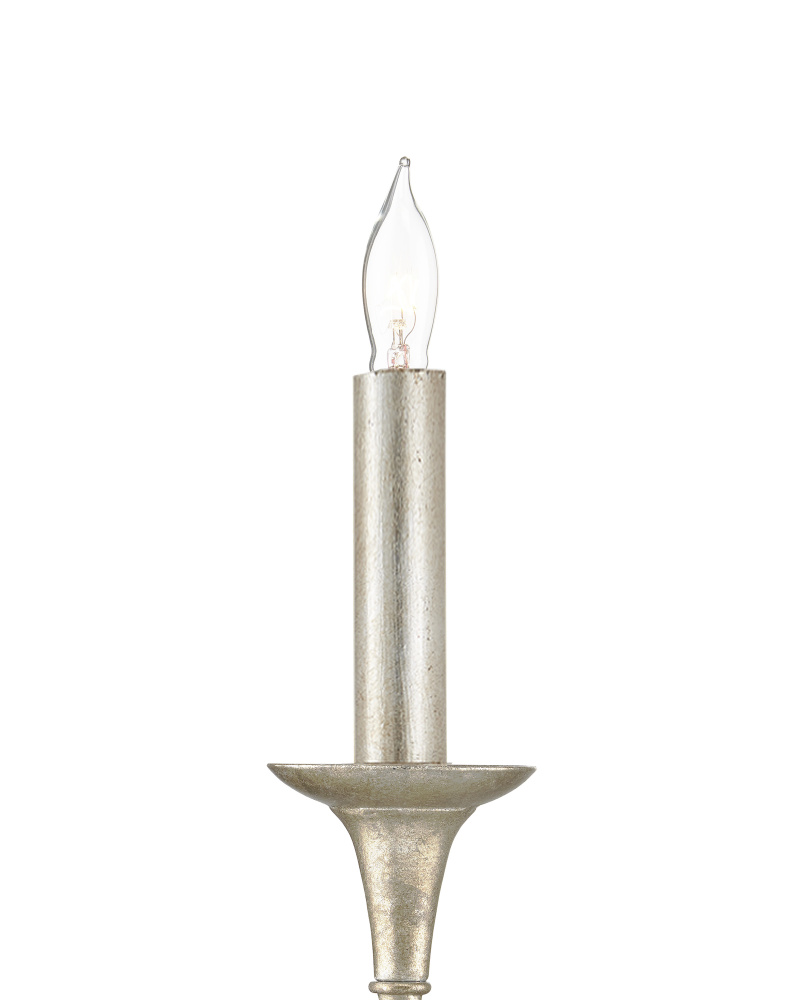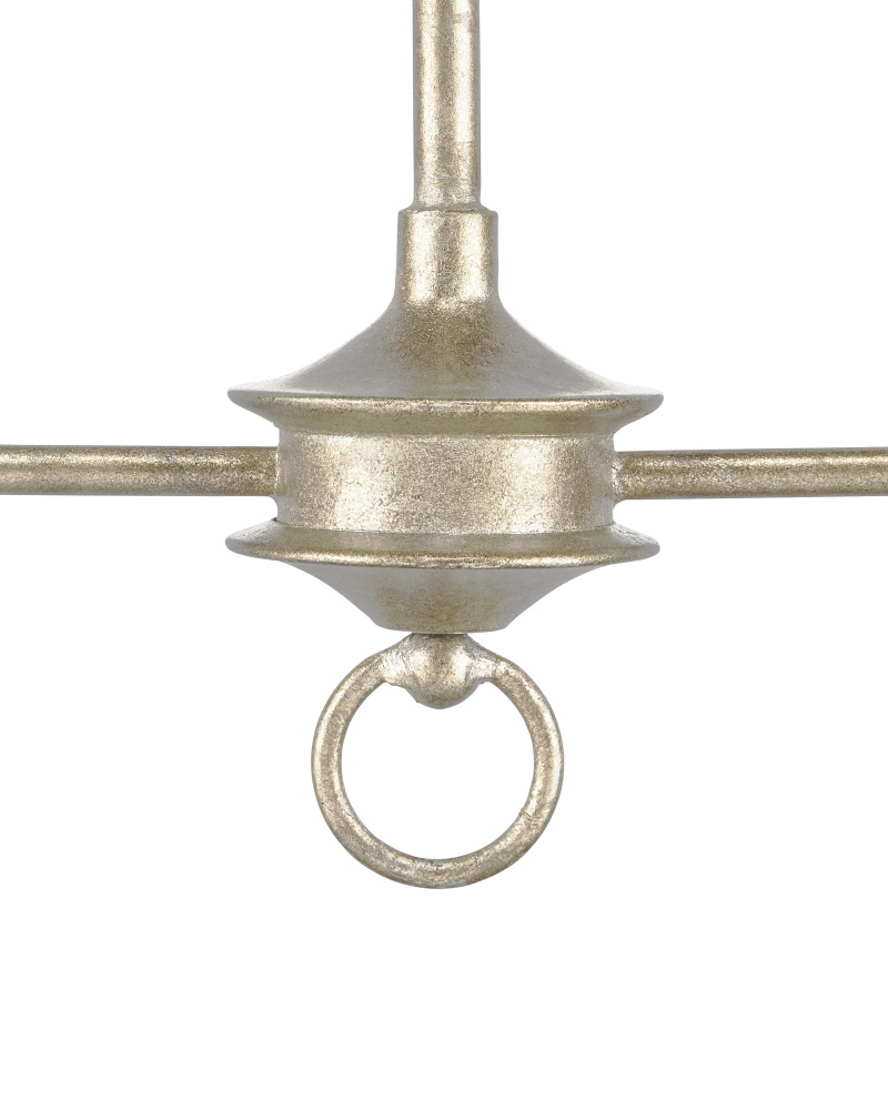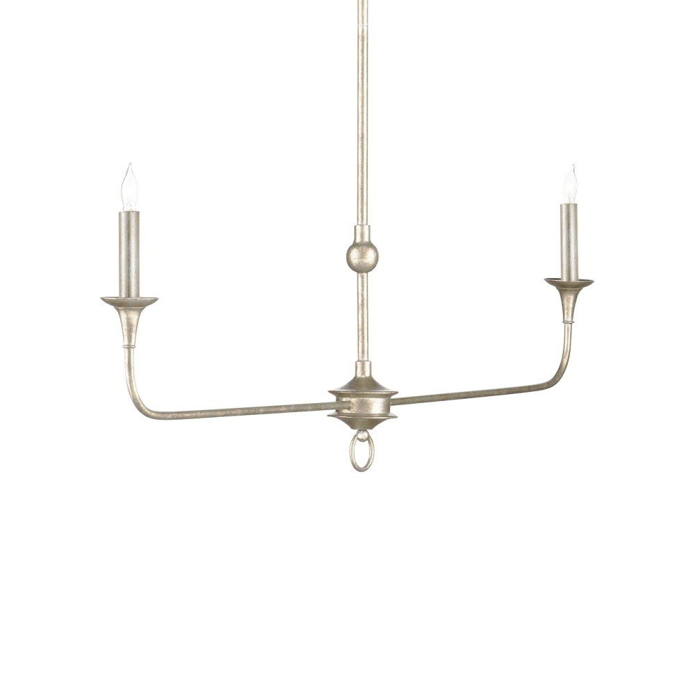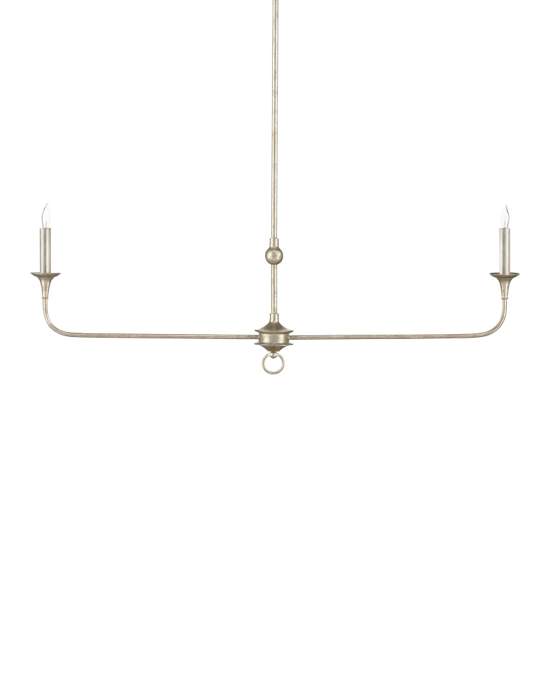 The arms of the Nottaway Linear Champagne Chandelier stretch gracefully from a petite cog at the bottom of its long, thin stem, which is ornamented with a dainty ring. Though the silver chandelier has minimalist lines, there is a sweeping fluidity to its profile that makes it a natural choice for above kitchen islands and bars or long dining room tables. The finish on the wrought iron frame brings textural interest to this dimmable two-light fixture. Adjustable from 23.25" to 65.25" with use of included chain/rod kit/cable. If your space calls for a longer drop, additional chain/rods/cable is available for purchase.