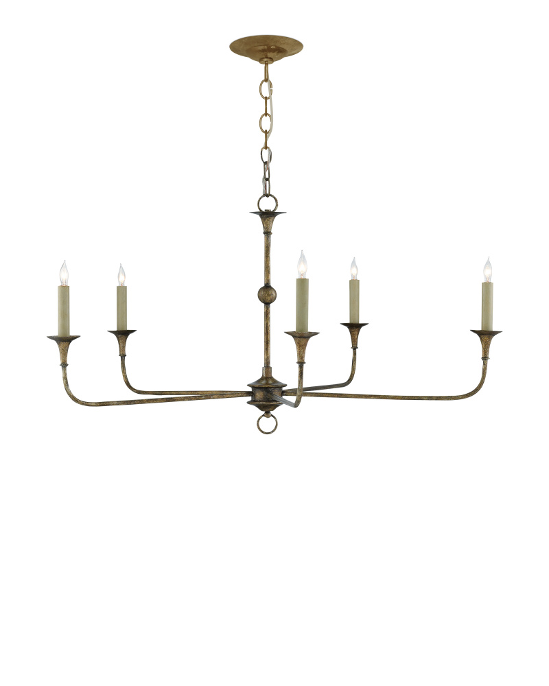The arms of the small bronze version of our Nottaway Chandelier stretch gracefully from a small cog ornamented with a ring that rests at the bottom of its stem. Though it is a seriously minimalist fixture, the profile of the five-light chandelier has a lovely fluidity to it that makes it a natural choice for traditional and transitional interiors. The Pyrite bronze finish to which the Nottaway has been treated adds textural interest to the chandelier. We offer the Nottaway in a grander version in bronze and in two sizes in a gold finish.