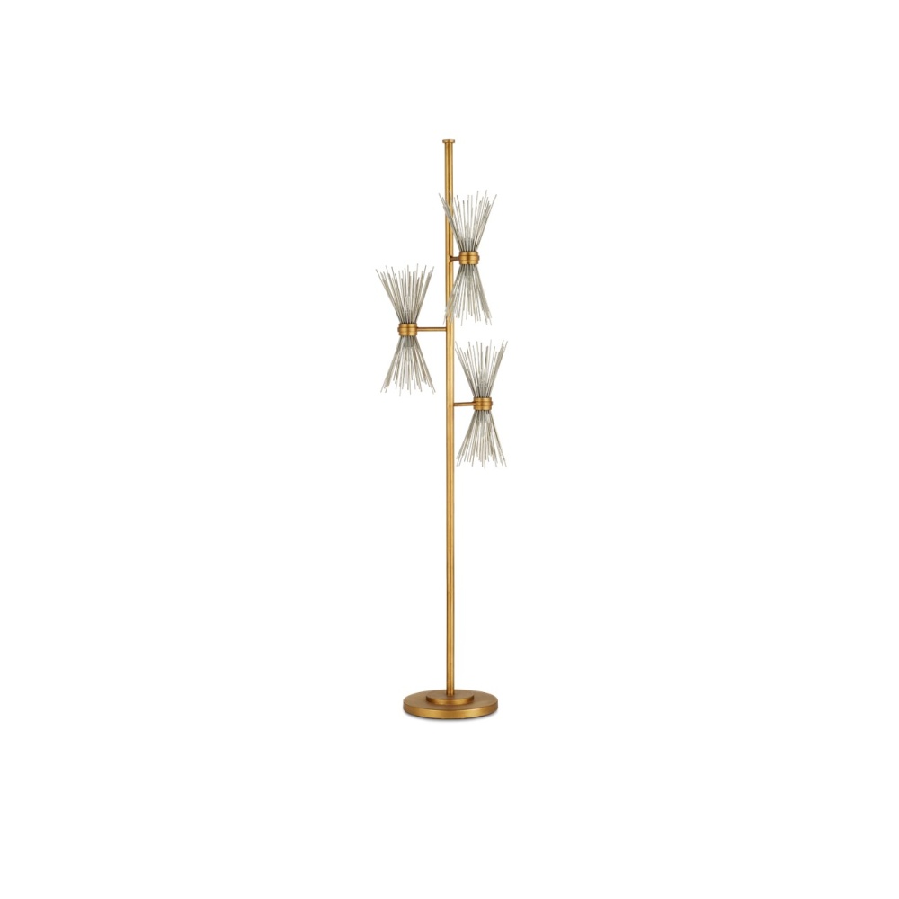 Exploding from articulated clasps, the shades of our Novatude Floor Lamp effervesce like spritzing stars. What makes this design dramatically beautiful is that the entire composition is made of wrought iron, even the thin ribs that make up the shades. The body and clasps of this piece have been treated to an antique gold leaf finish, while the spikes covering the bulbs are in a gleaming contemporary silver leaf finish.