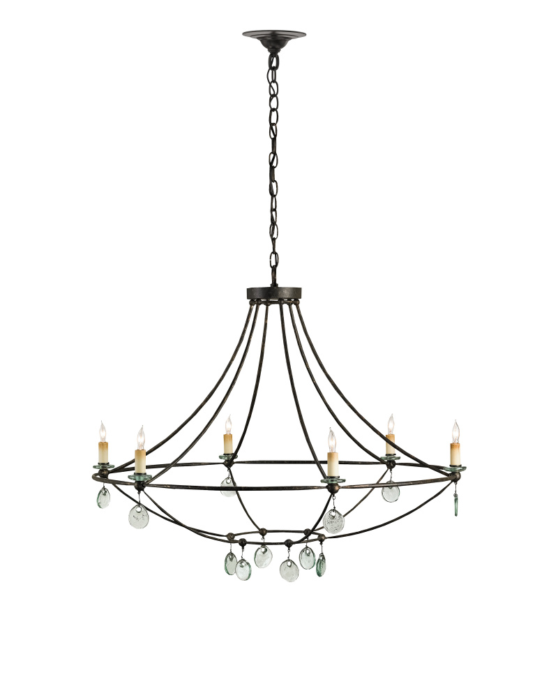 Reading like a buxom vessel descending from the heavens, the linear design of the Novella Chandelier showcases timeless craftsmanship and the creative use of materials. Not only was recycled glass used to create the bobeches, the disks that adorn the six-light fixture were created from the same material, which takes on a sheen when light strikes it. The wrought iron frame has been treated to a Mayfair finish for an anchoring effect.
