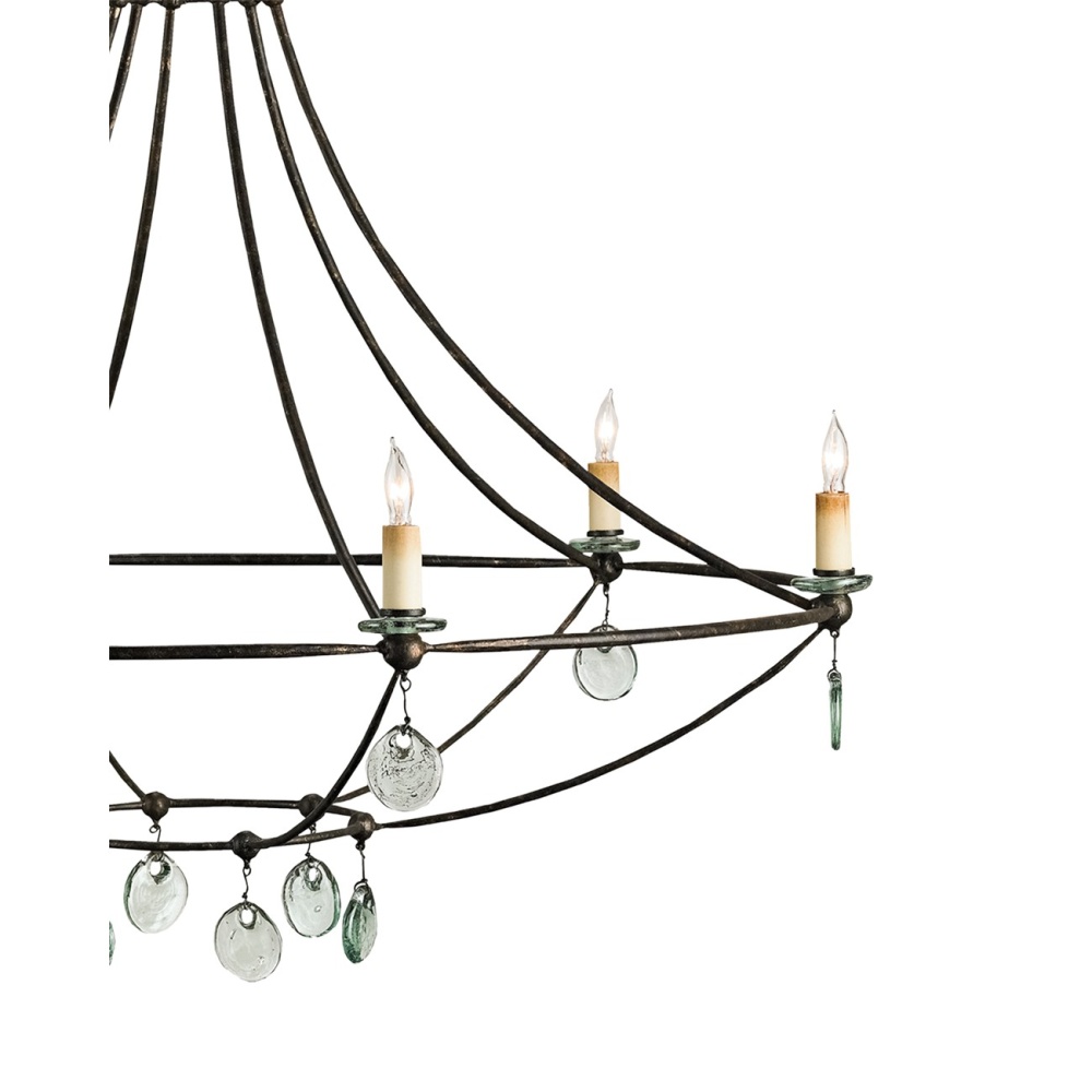 The Novella Chandelier showcases timeless craftsmanship and a creative use of materials. Recycled glass, which takes on a sheen when light strikes it, was used to create the bobeches and disks that adorn the black chandelier. The wrought iron frame in a Mayfair finish has an anchoring effect. Adjustable from 35" to 102" with use of included chain/rod kit/cable. If your space calls for a longer drop, additional chain/rods/cable is available for purchase.