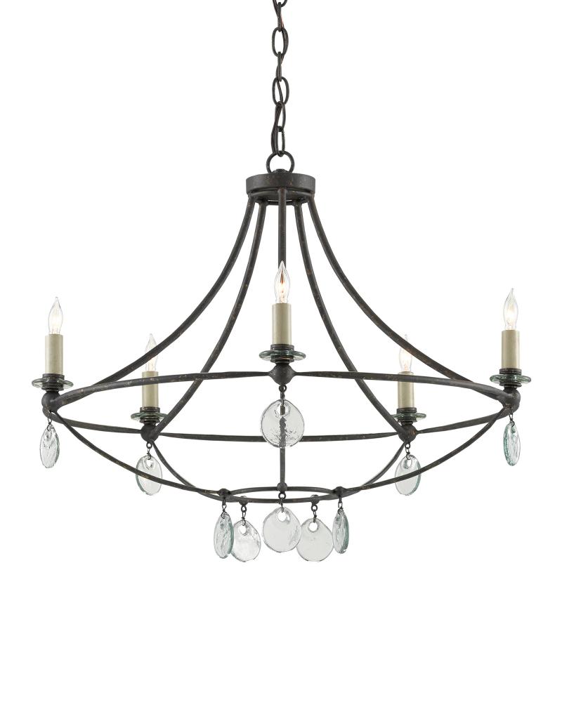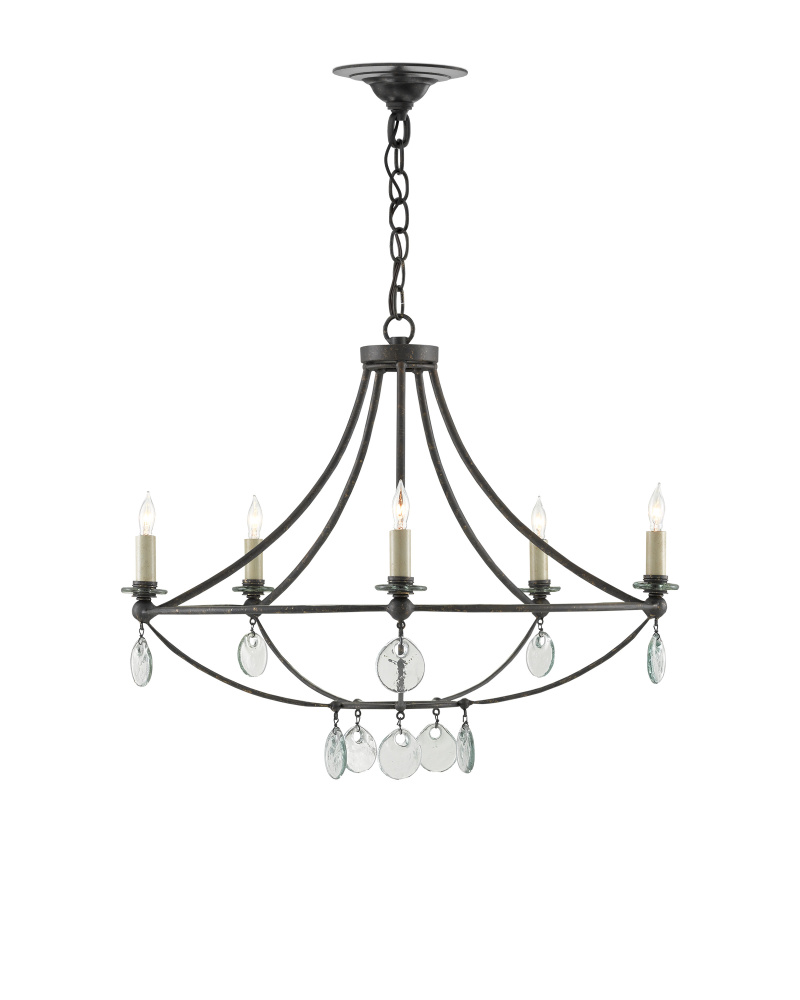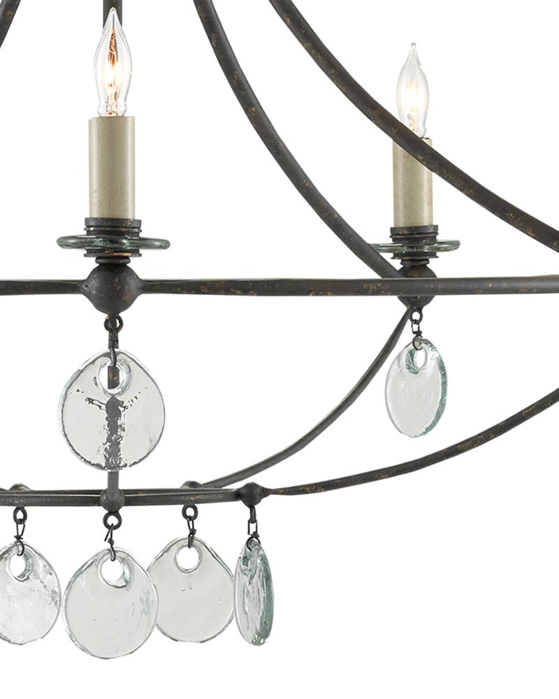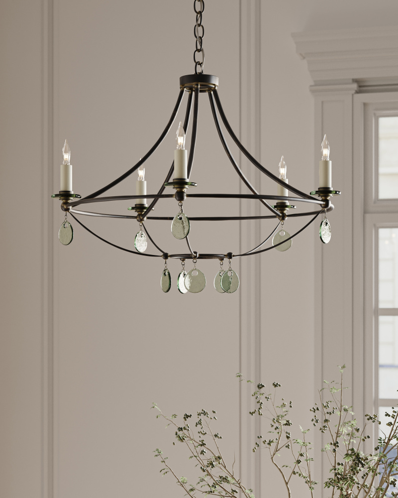 The Novella Small Chandelier showcases timeless craftsmanship and a creative use of materials. Recycled glass, which takes on a sheen when light strikes it, was used to create the bobeches and discs that adorn the black chandelier. The wrought iron frame in a Mayfair finish has an anchoring effect. Adjustable from 26.5" to 94.5" with use of included chain/rod kit/cable. If your space calls for a longer drop, additional chain/rods/cable is available for purchase.