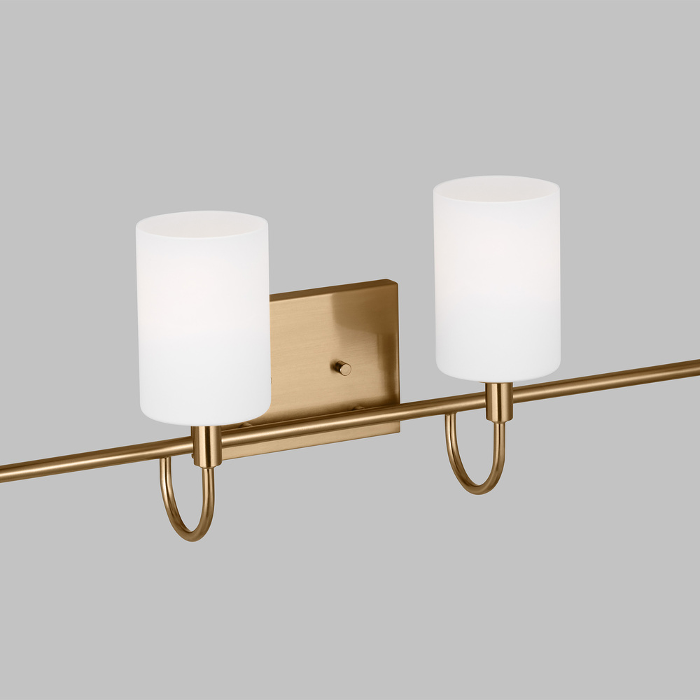 Oak Moore is a universal vanity series available in four finishes. Curved bar detail and etched white shade give it a transitional look. Install the light with glass shades up or down to light up every corner of your room. The shades are made of Etched White glass to cast a soft light throughout your vanity area.
