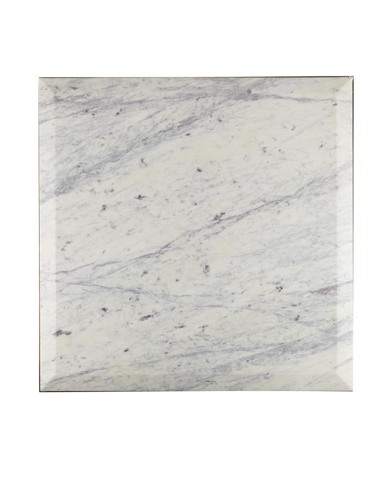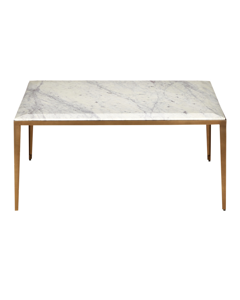 The Oblique Marble Cocktail Table is a refined statement piece that combines masterful metalwork with luxurious stone. Its tapered legs and intersecting frame in an antique brass finish holds the chamfered top, which is made of exquisite white lilac marble and sits slightly elevated above the frame. This creates a striking floating effect. The marble’s subtle veining will vary from piece to piece.