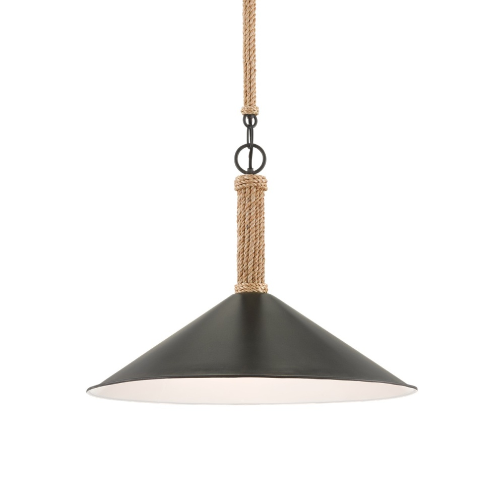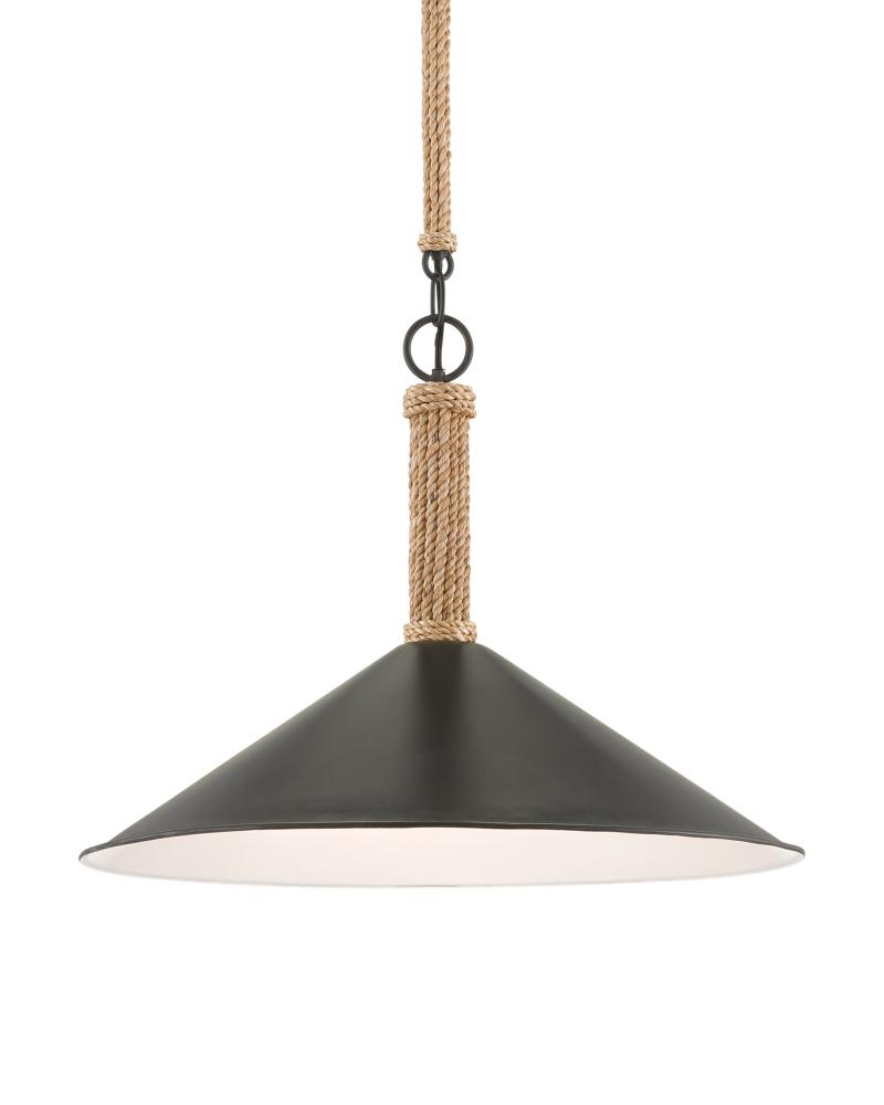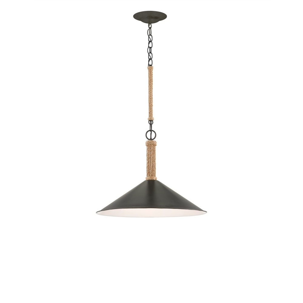 The Ocracoke Pendant has a spun metal shade in a blacksmith finish. A design note worth mentioning is how It's hung: rope-covered metal links add a bit of natural charm to the black pendant. The interior of the shade, in a sugar white finish, makes its illumination crisp. Adjustable from 22" to 101" with use of included chain/rod kit/cable. If your space calls for a longer drop, additional chain/rods/cable is available for purchase.