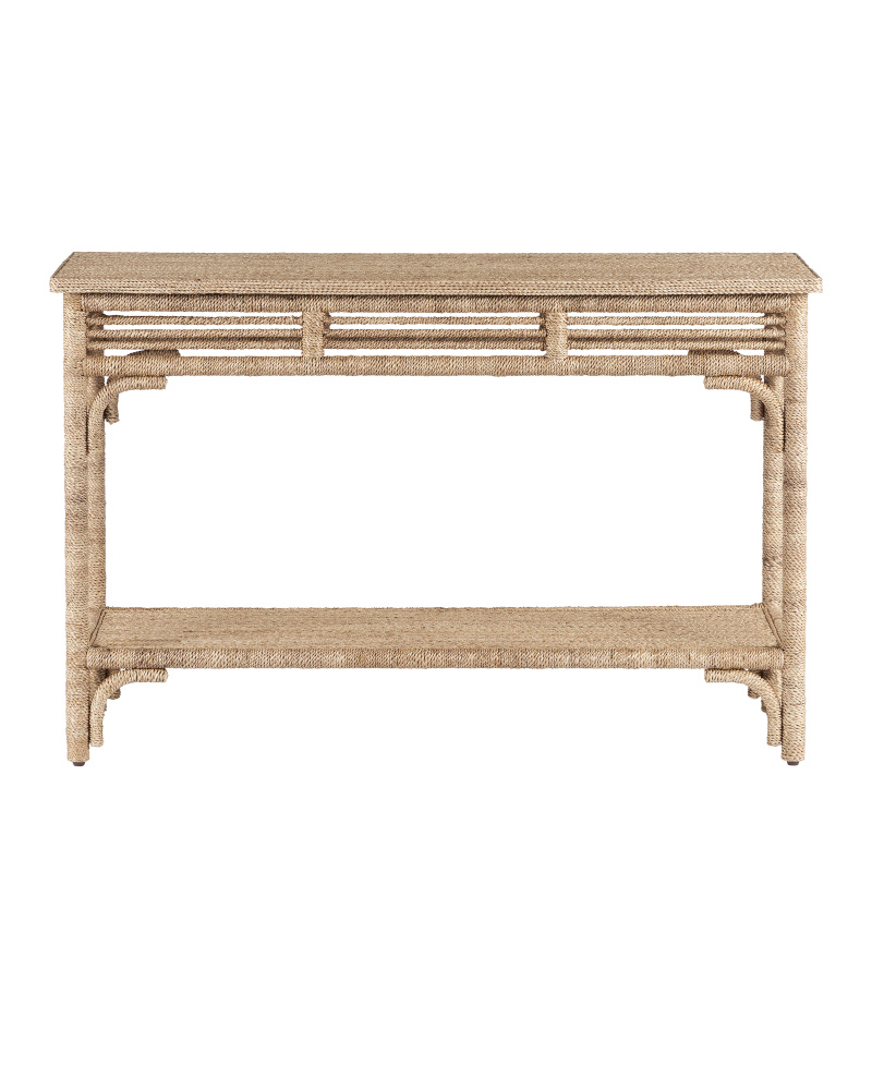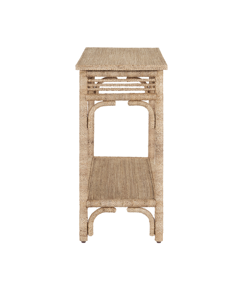 With the earthy feel of rattan and wicker, the Olisa Rope Console Table is covered in braided Abaca rope to bring a natural elegance to a room. The dexterity required to wrap a piece of furniture so skillfully makes this tan console table special.