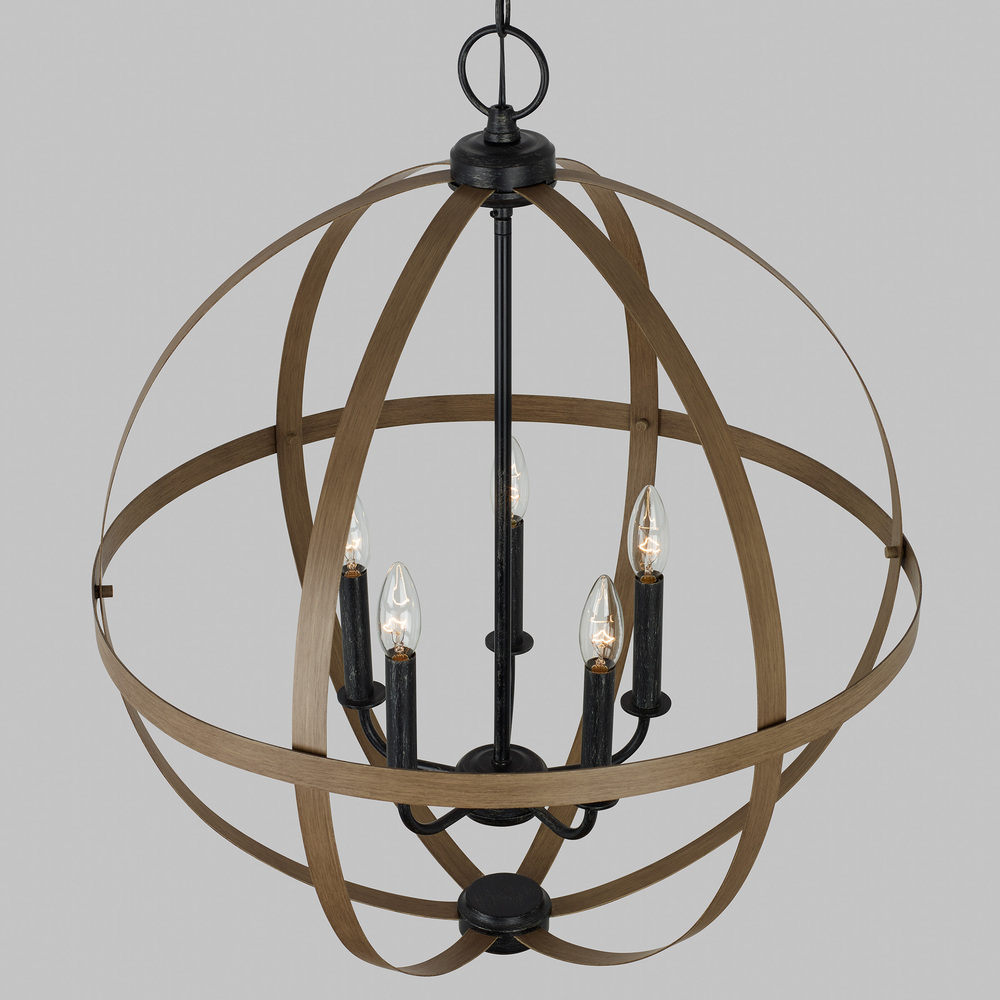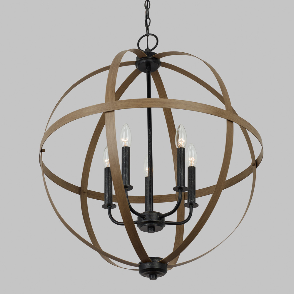 The silhouette of the modern Calhoun five-light chandelier features an interlocking, spherical steel frame, which harkens back to the Unisphere constructed for the 1964 New York World's Fair. The minimalist Calhoun Series draws the eye to the soft, warm glow of the light emitted from the cylindrical Satin Etched glass shades. Fixture offered in a Cerused Oak with Stardust finish. Incandescent and ENERGY STAR-qualified LED lamping are available.