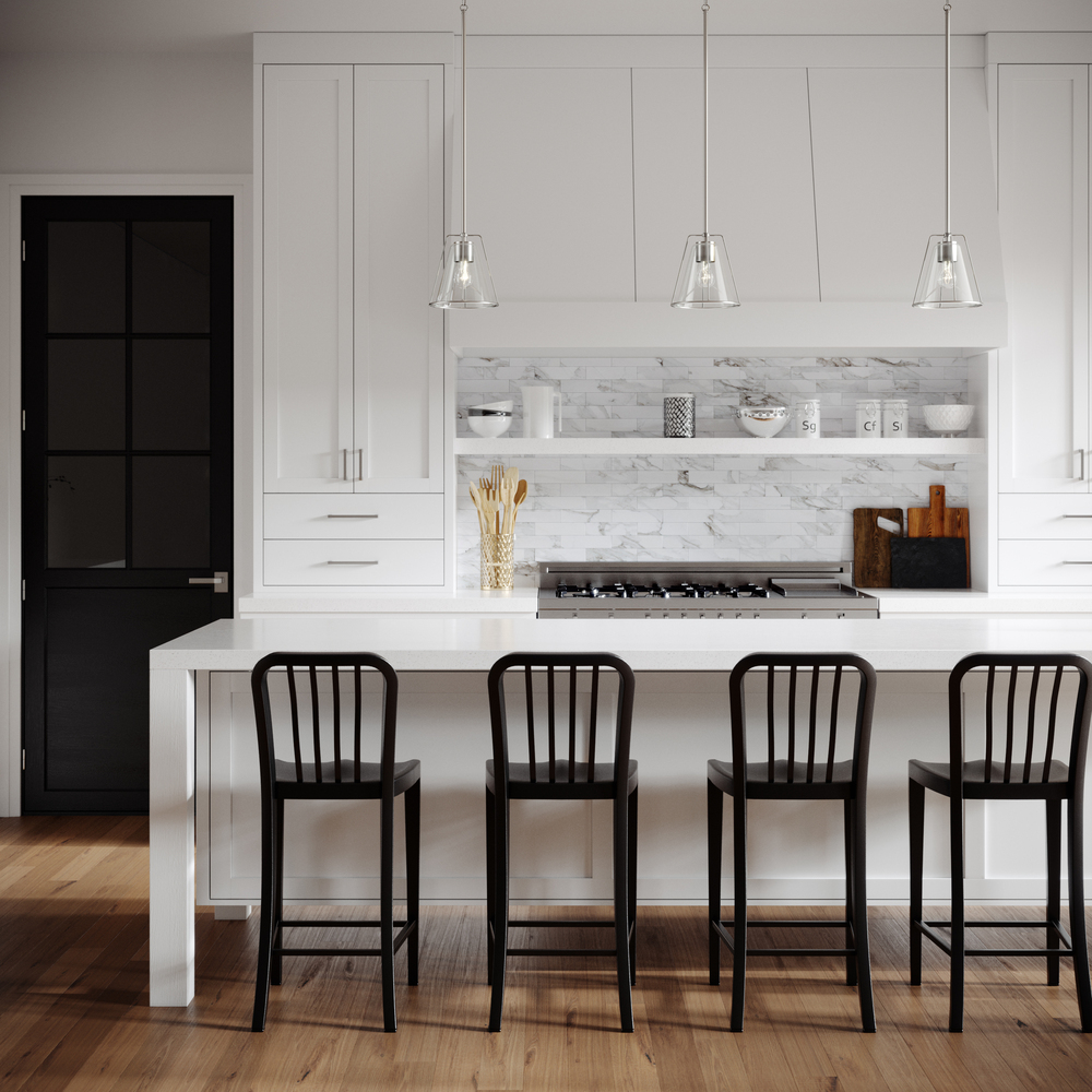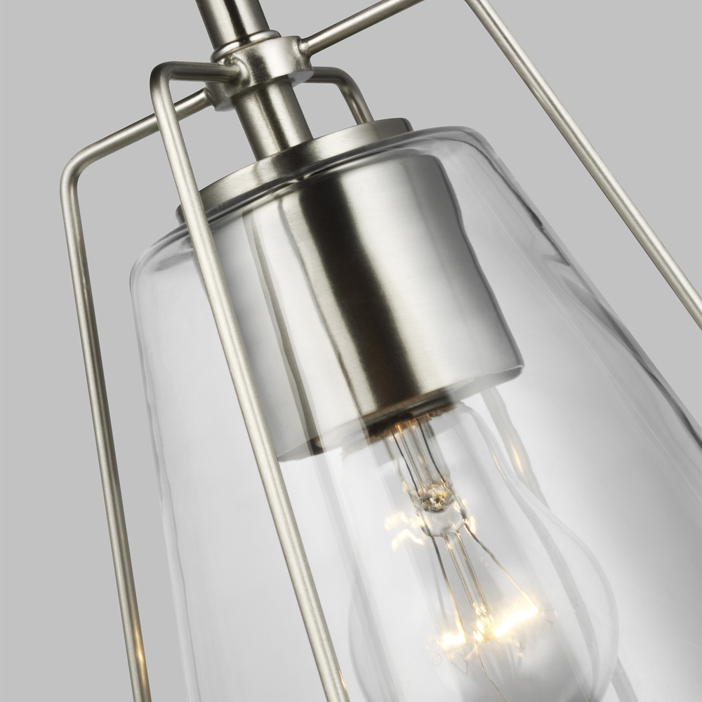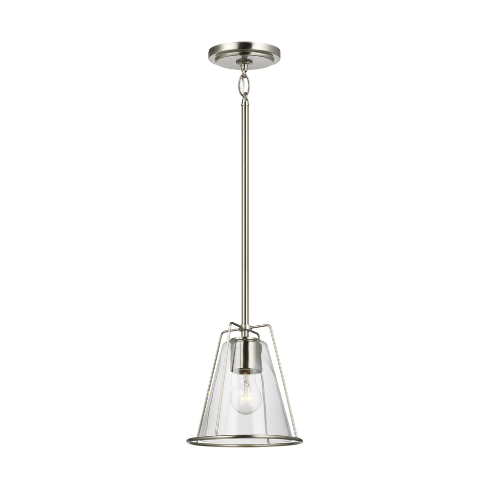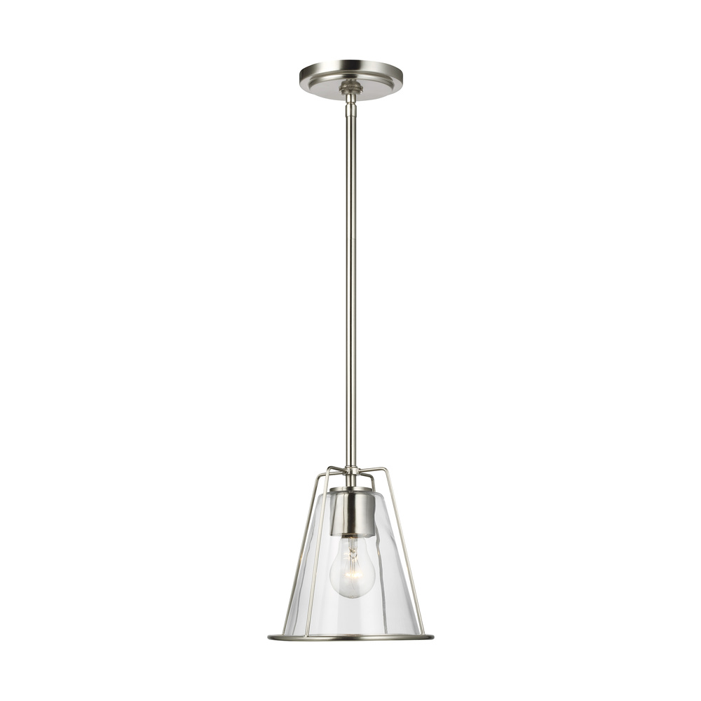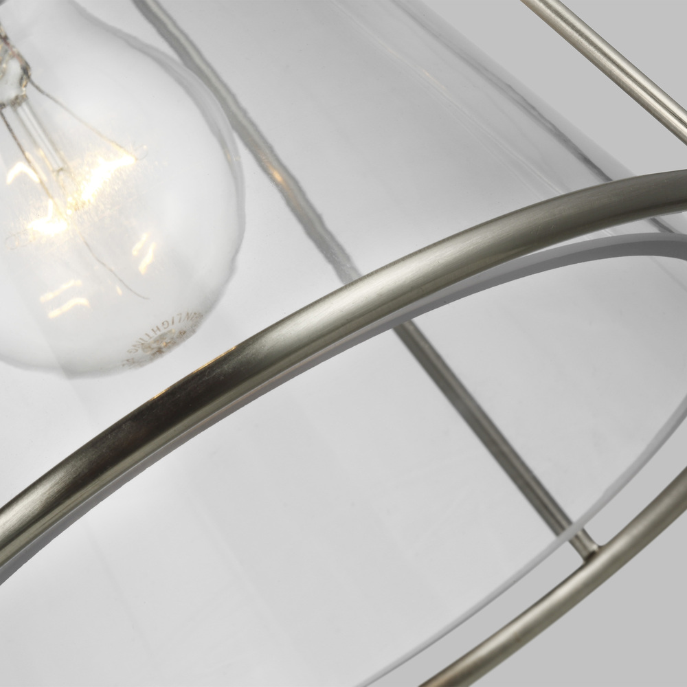 The Framework one light indoor pendant is offered in Brushed Nickel, Matte White and Midnight Black. Crafted of metal with a flared silhouette and clear glass shade. Can be used in multiples above a kitchen island or long dining table for added impact. Both incandescent lamping and ENERGY STAR-qualified LED lamping are available; all fixtures are California Title 24 compliant.