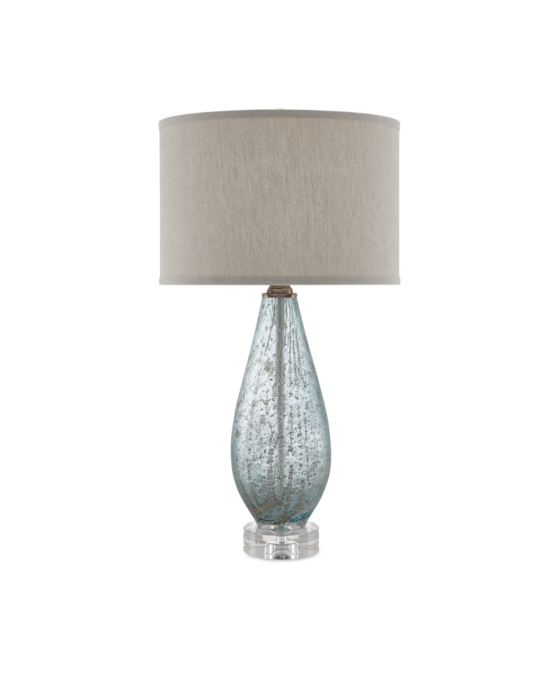 The Optimist Table Lamp has pale blue tones running through its speckled glass. Sitting atop an optic crystal base, the light blue lamp is topped with a natural linen shade that brings added elemental style to the glass lamp.