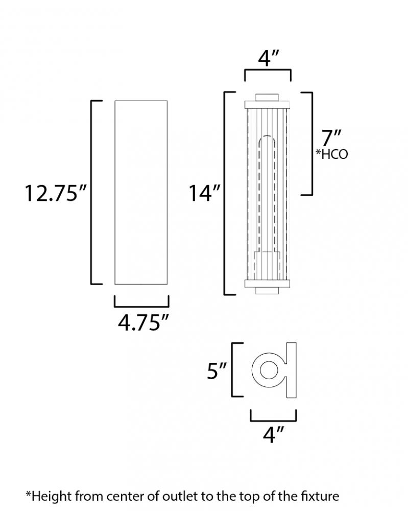 Internally ribbed clear glass tubes refract tubular lamps, creating a shimmering light effect. The glass is supported by a two-tone black frame with Aged Brass accents, making this sconce suitable for both indoor and outdoor installations. With a depth of