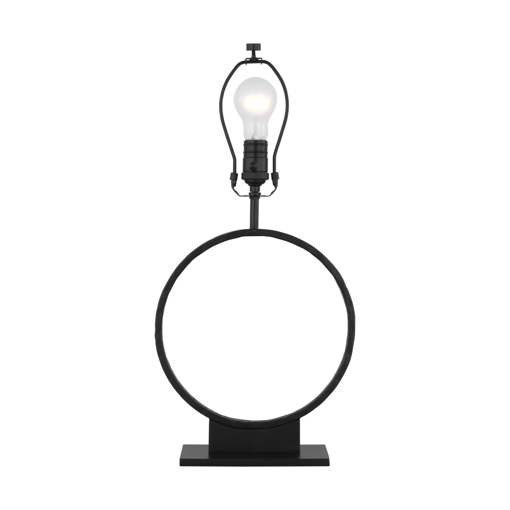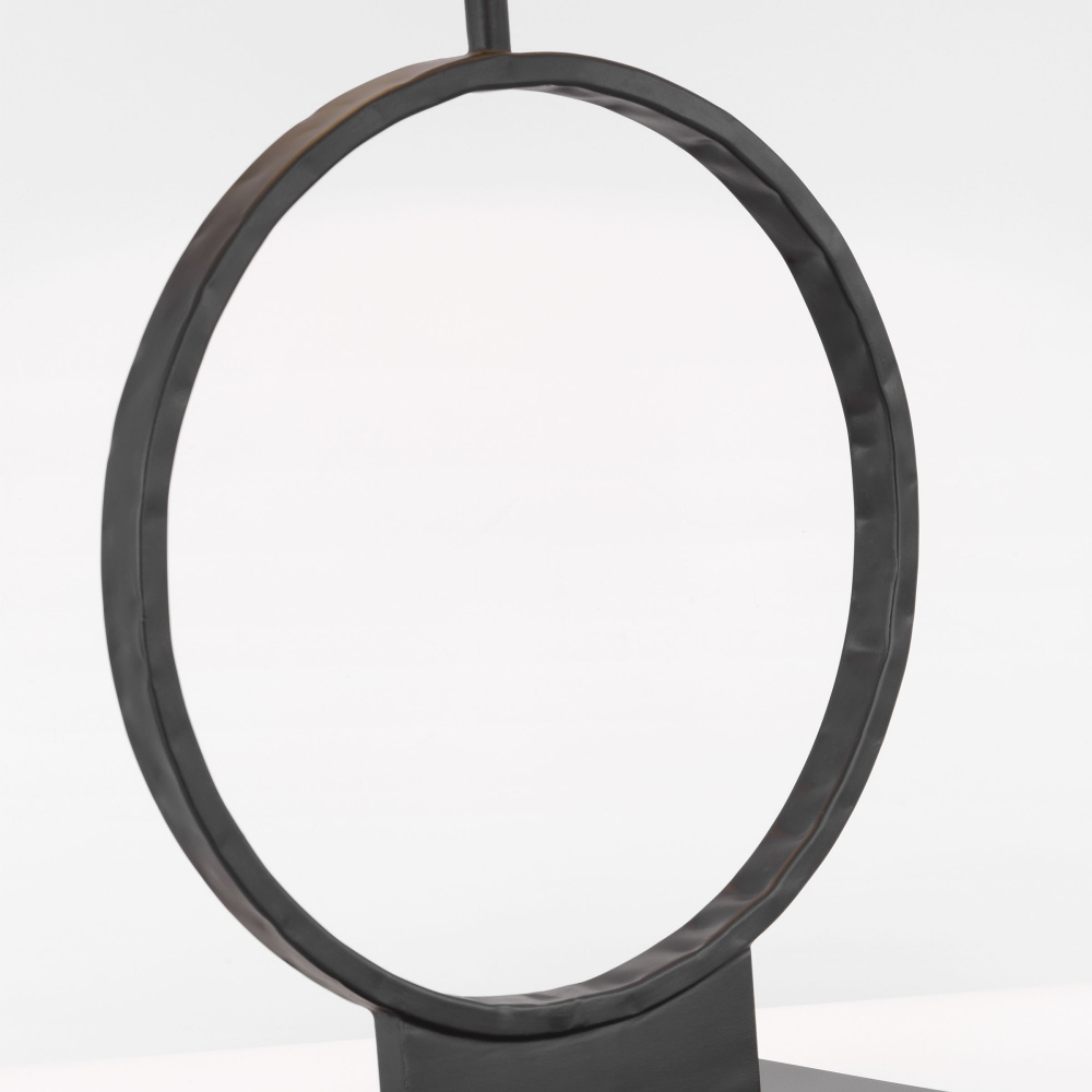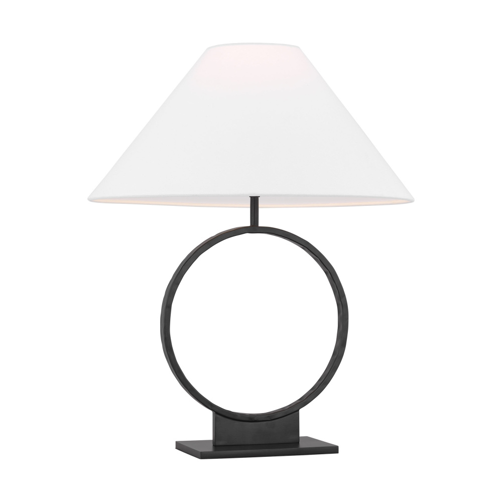 Inspired by tribal and bohemian styles, the Orion table lamp by Ellen DeGeneres is adorned in an aged iron hand-carved texture and a square flat base. The lamp is paired with a triangular white linen shade. The Orion table lamp is a perfect study in the beauty of contrasting shape and material. Solid, hand-forged cast iron is shaped into an elliptical lamp base, creating a delicate oval curve out of a robust metal medium.