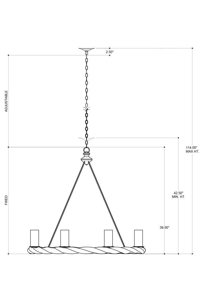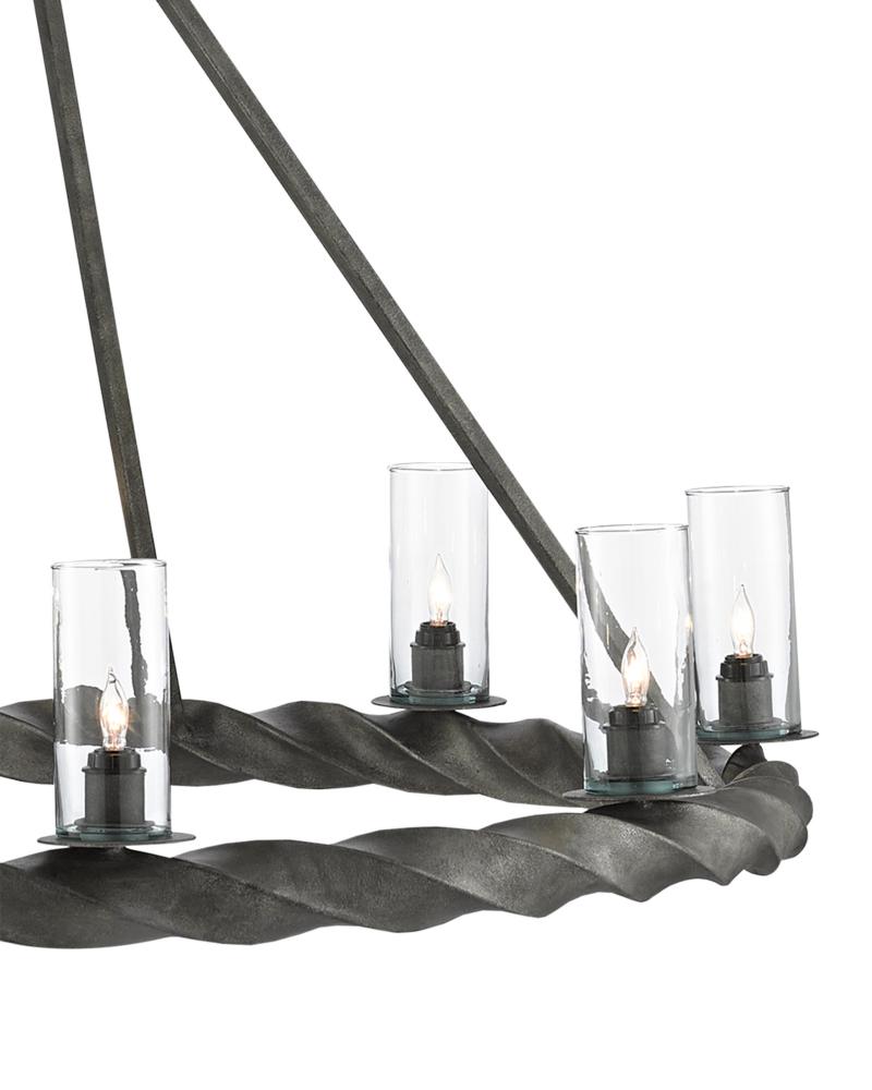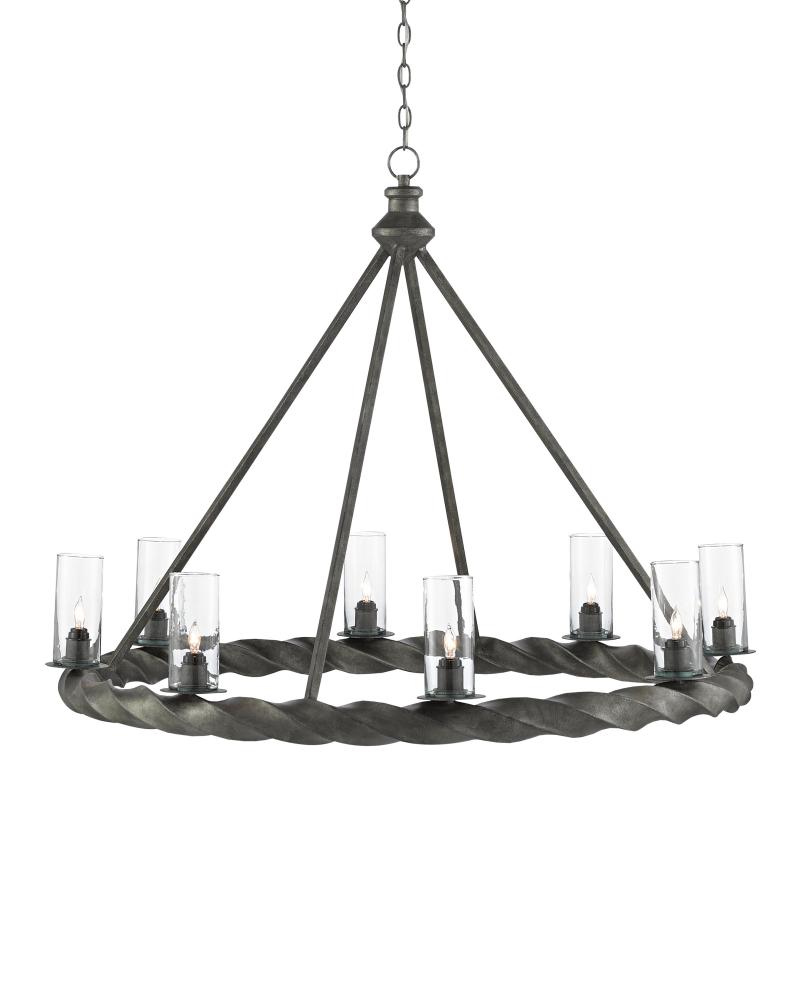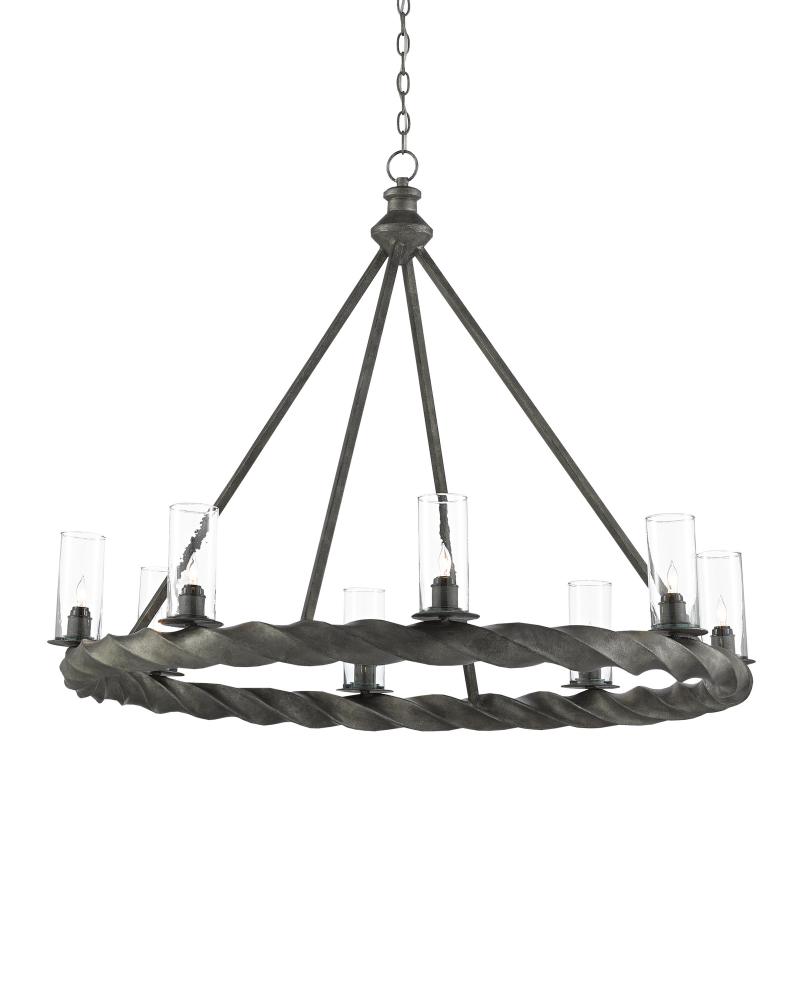 The traditional shape of the Orson Chandelier is cemented by a bottom ring in a rope motif made of wrought iron. The light Mole finish, the patina, and the clear glass canisters are design notes that bring this black chandelier a handsome profile. Adjustable from 45.5" to 113.5" with use of included chain/rod kit/cable. If your space calls for a longer drop, additional chain/rods/cable is available for purchase.
