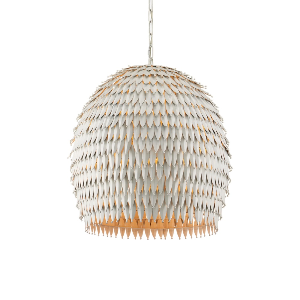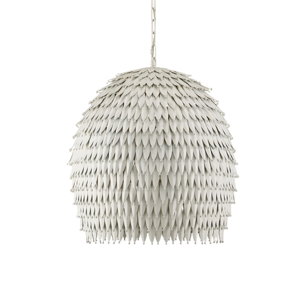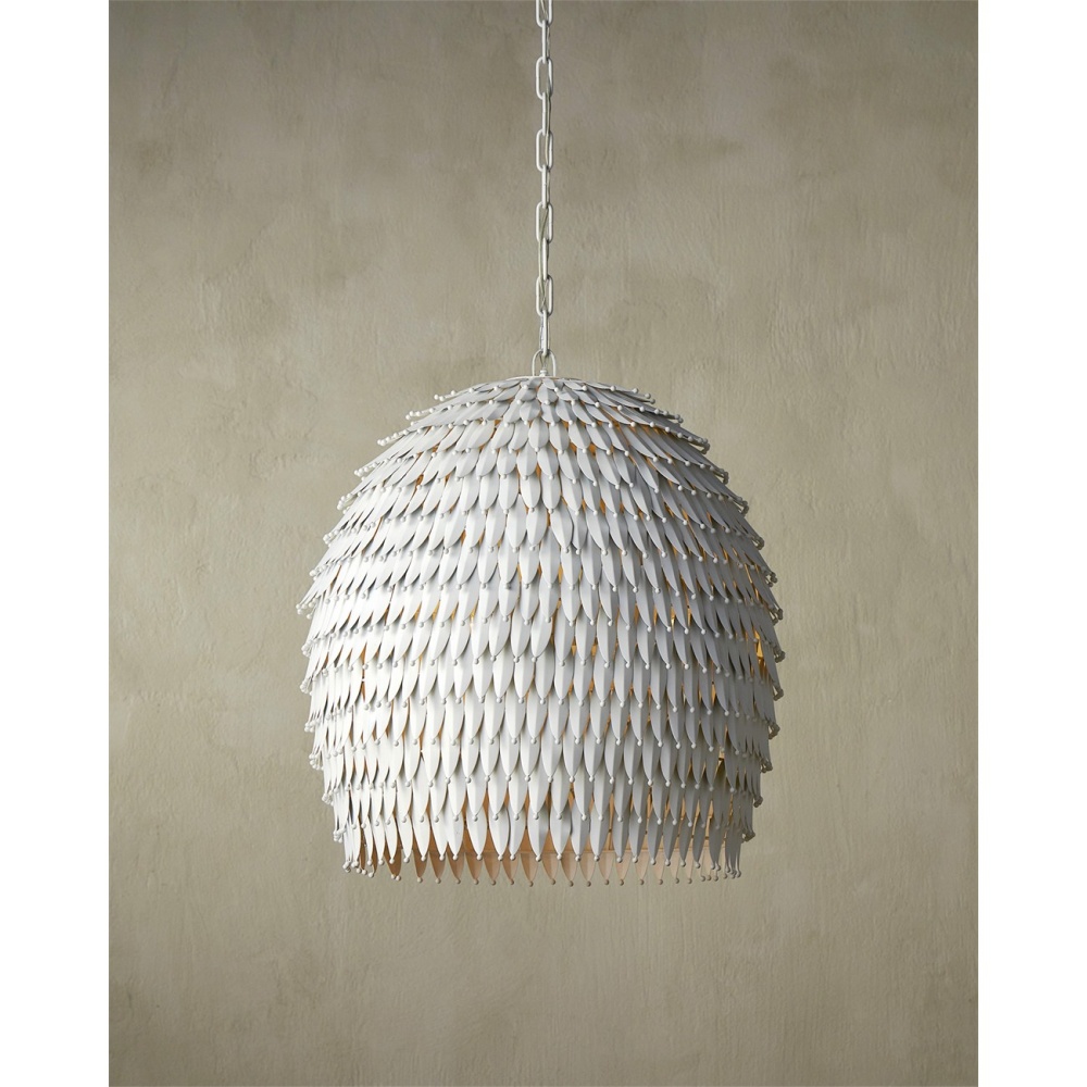 The Overlay Large Pendant is a artisanal creation that is painstakingly made by hand, as each of the leaves are individually cut and welded to the frame and the dots on the edges of the spiky cut-outs are welded on. The elongated-dome shape of the white pendant has a sartorial feel thanks to the textural richness of the fluted edges flowing downward like a couture wedding dress might. Adjustable from 32" to 100" with use of included chain/rod kit/cable. If your space calls for a longer drop, additional chain/rods/cable is available for purchase.