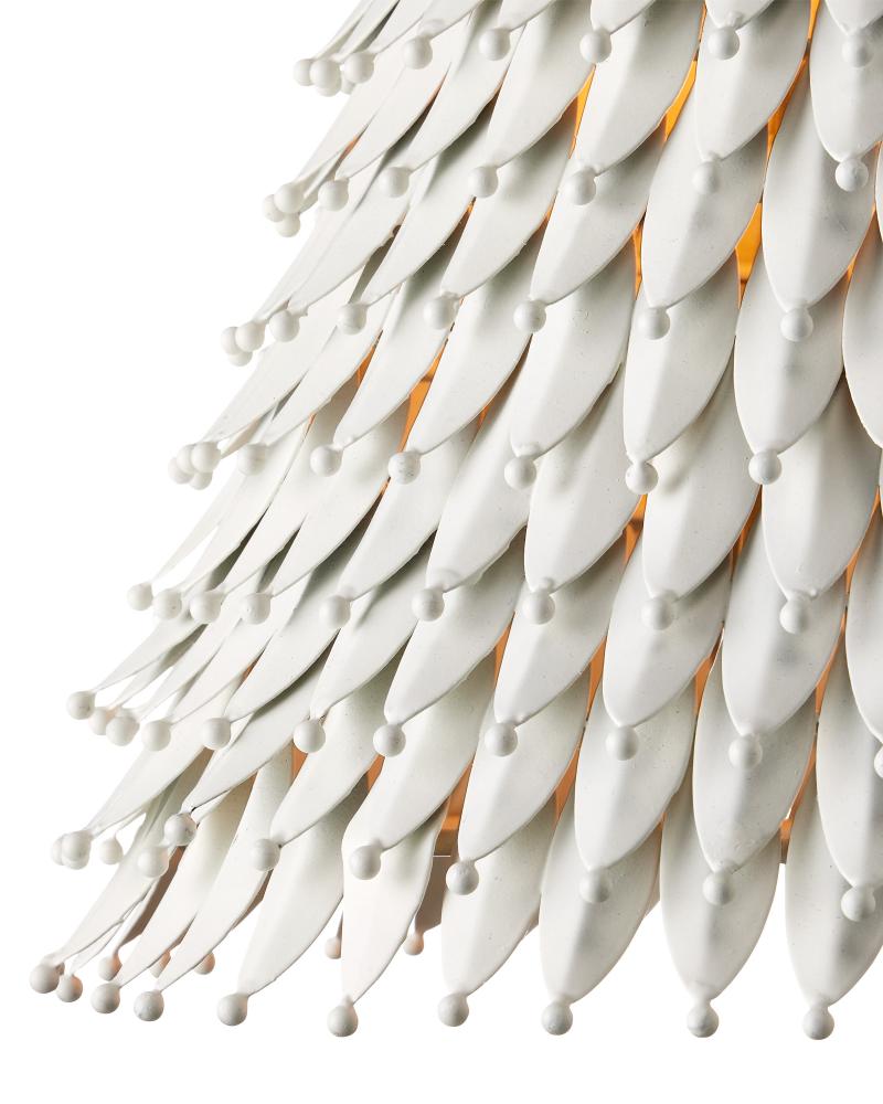 The Overlay Small Pendant is a artisanal creation that is painstakingly made by hand, as each of the leaves are individually cut and welded to the frame and the dots on the edges of the spiky cut-outs are welded on. The bell shape of the white pendant has a sartorial feel thanks to the textural richness of the fluted edges flowing downward like a couture wedding dress might. Adjustable from 19.5" to 87.5" with use of included chain/rod kit/cable. If your space calls for a longer drop, additional chain/rods/cable is available for purchase.