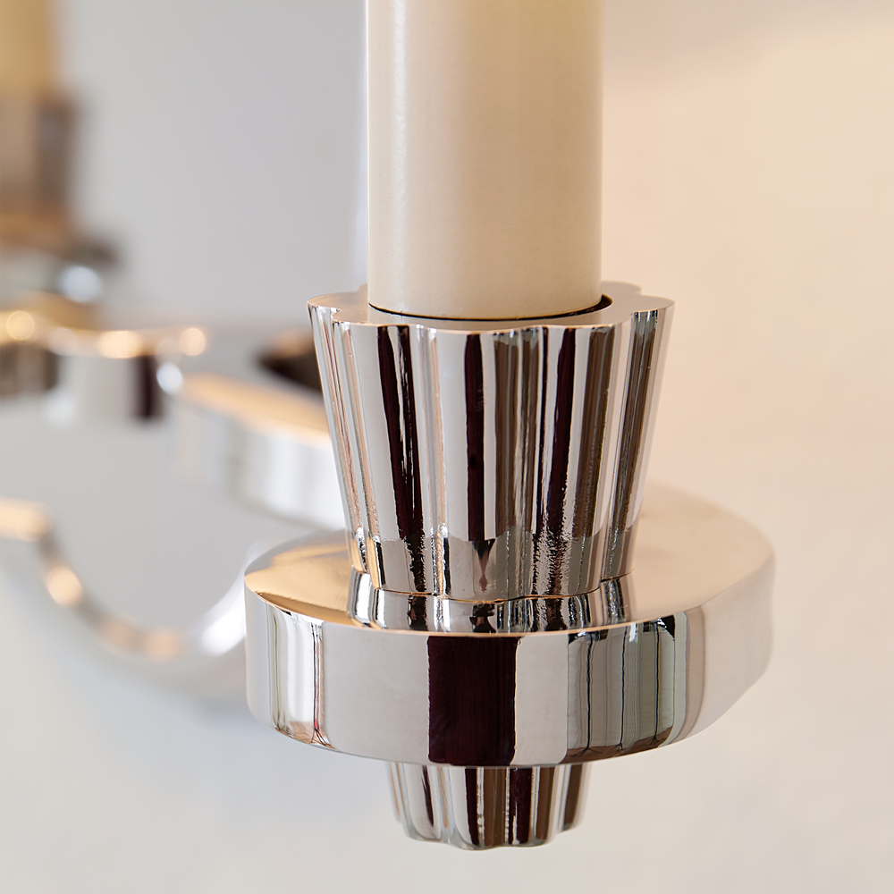 Paisley is a classic shaded series with intentional contemporary details. On the chandelier, the eye is instantly drawn to the hub, whose soft riveted design extends to candle tubes that share the same design element.