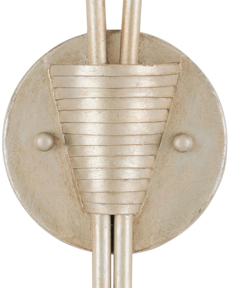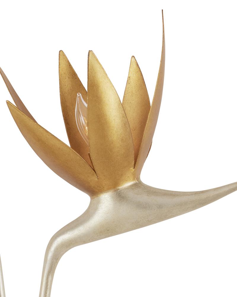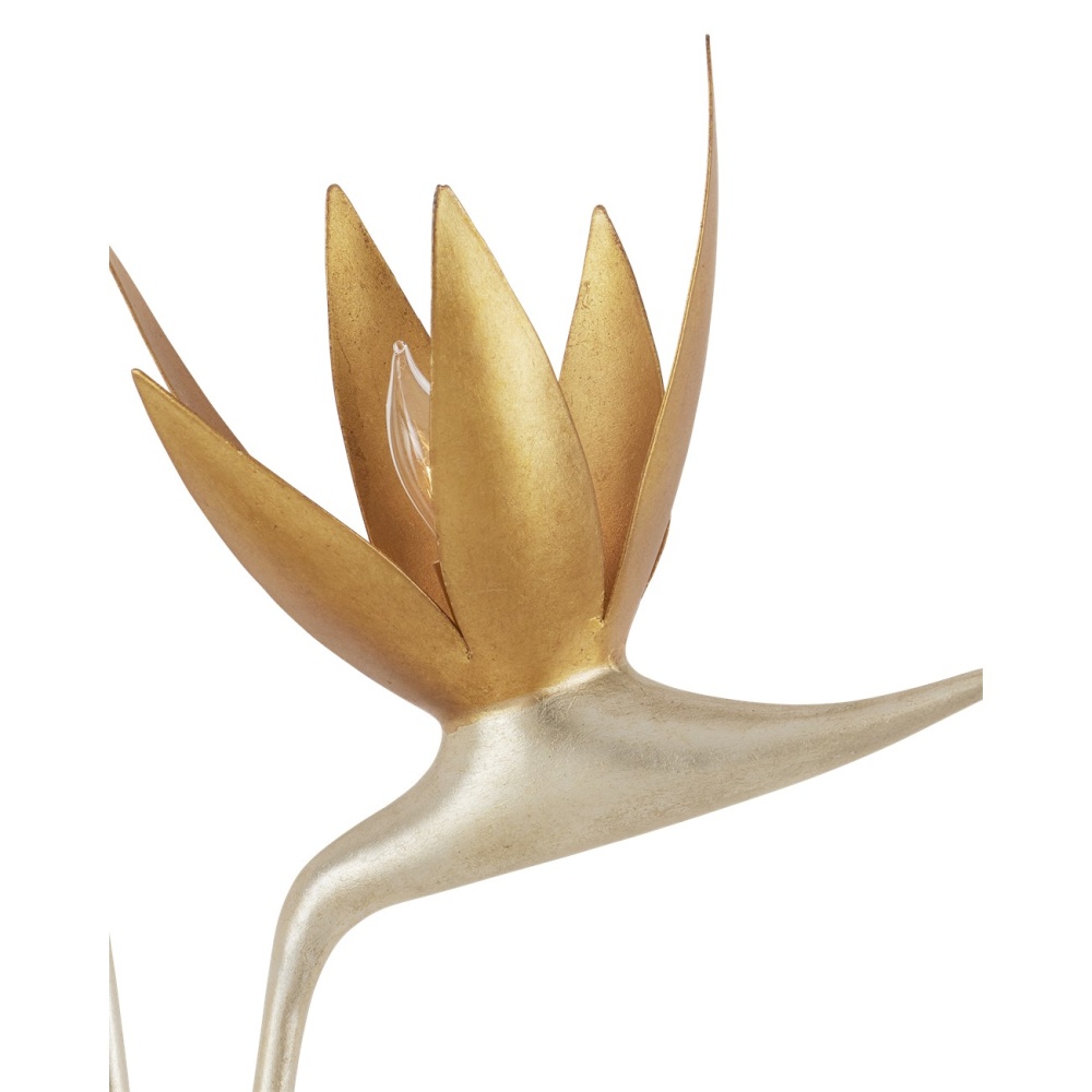 Made of steel, the left-facing Paradiso Gold & Silver Wall Sconce has a lyrical shape inspired by the Strelitzia reginae, more commonly known as the Bird of Paradise plant. The limbs that arc up and away from a central cone are in a contemporary silver leaf finish, while the blossoms that flow around the light bulbs are in a contemporary gold leaf finish. This silver and gold sconce is an example of how nature-inspired design elements are driving the biophilic movement.