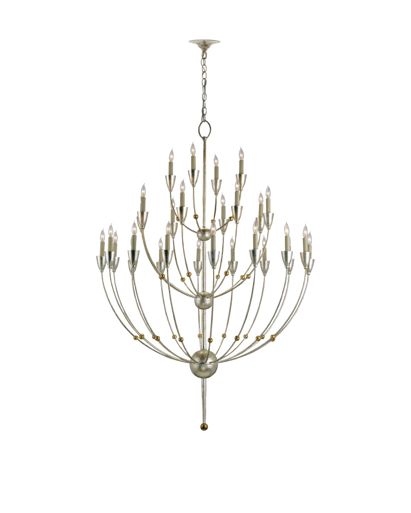 There is good reason the Paradox Chandelier is swept up in its own glory, as it resolutely defies gravity to live up to its name. This fabulous three-tiered fixture presents clusters of slender wrought iron arms reaching up toward wooden candle cups that hold points of illumination. The prevailing silver leaf finish gives this 28-light fixture a very modern feel, while the tiny gold-leaf globes that stud the arms bring a contrasting warmth.