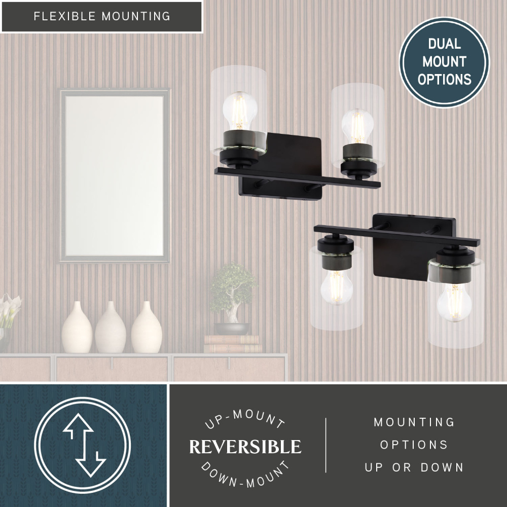 Bring a touch of minimalist sophistication to your bathroom with the Park Ridge 2-Light Vanity. Its matte black finish and clear cylindrical glass shade create a striking focal point, casting a crisp, radiant glow perfect for any bathroom setting. Whether your style is contemporary, transitional, or even modern farmhouse, its clean lines and timeless design will complement your décor. The streamlined, straight bar design offers a contemporary edge, seamlessly blending transitional and modern aesthetics, while ensuring a quick and effortless upgrade to your space. Experience the perfect balance of style and function, transforming your bathroom into a personal sanctuary.