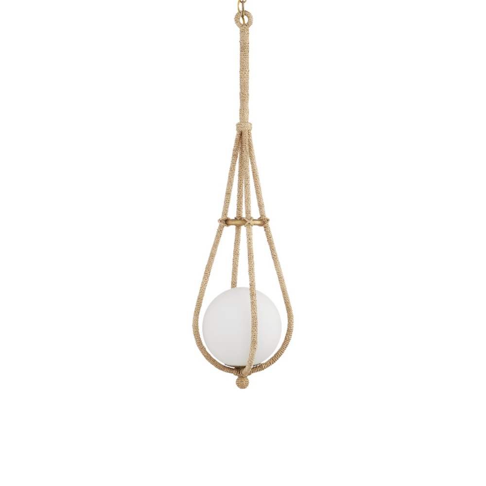 The Passageway Pendant is a cleverly designed ceiling light that combines the warmth of rope wrapping with a dorado gold finish, contrasting beautifully with the frosted glass globe to give the design a sense of heft. Four arms hold the globe in place, one of which is removable to make changing the bulbs on this tan pendant easy. This fixture is perfectly suited to nautical environments, given its seaworthy shape. Adjustable from 43.5" to 111.5" with use of included chain/rod kit/cable. If your space calls for a longer drop, additional chain/rods/cable is available for purchase.