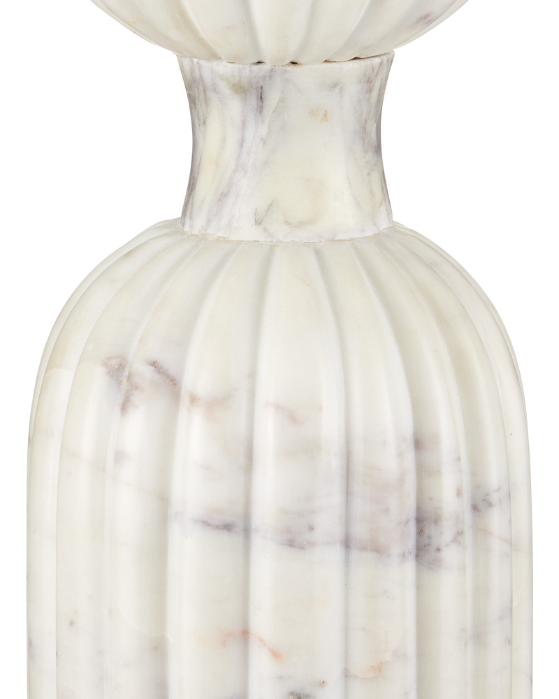 The Passementerie Drinks Table is a sculptural statement piece crafted from exquisite Banswara marble, known for its striking white surface with subtle purple veining. The tall, slender pedestal is carved to mimic two interconnected tassels—one rising toward the tabletop and the other descending toward the floor, the two cinched in the middle to create a captivating silhouette. The white table measures just over 27 inches tall while the top is 11 inches in diameter.