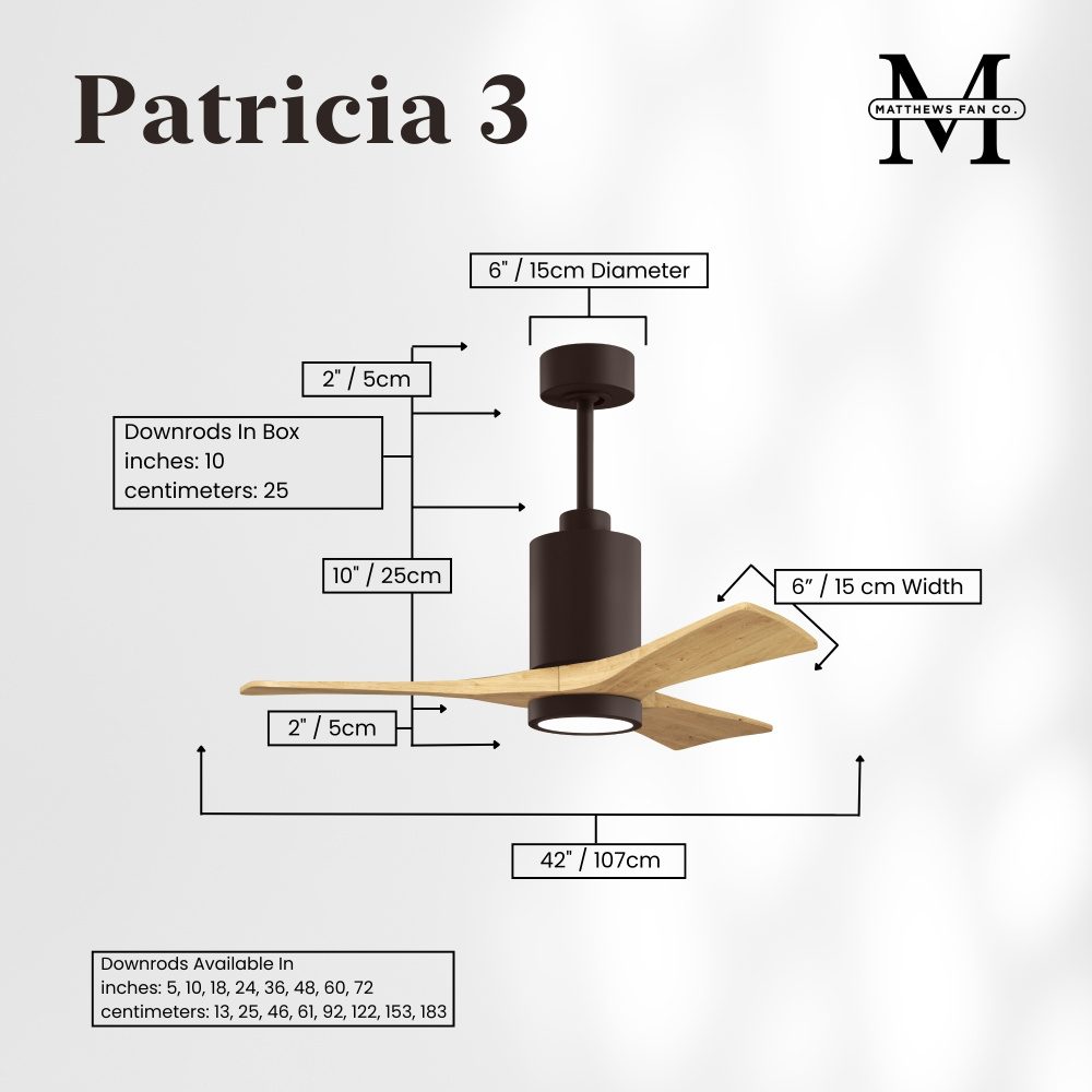 A complement to any commercial or residential space, the Patricia 3 seamlessly combines innovation with simple, refined design. Its elegant aesthetic belies its robust construction. Solid wood blades revolve around a balanced, cylindrical DC motor housing. Air is circulated efficiently with barely more than a whisper. An eco-conscious 5CCT LED color changing light kit completes the package, making Patricia 3 sophisticated, efficient and green.
