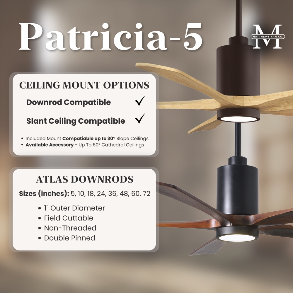 A complement to any commercial or residential space, the Patricia 5 seamlessly combines innovation with simple, refined design. Its elegant aesthetic belies its robust construction. Solid wood blades revolve around a balanced, cylindrical DC motor housing. Air is circulated efficiently with barely more than a whisper. An eco-conscious LED light kit completes the package, making Patricia 5 sophisticated, efficient and green.